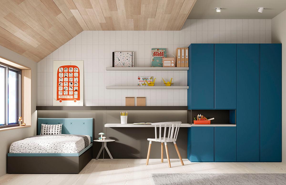 Детская композиция с каркасной кроватью. Мягкое изголовье, шкаф для одежды Dressbox и стол Levita.