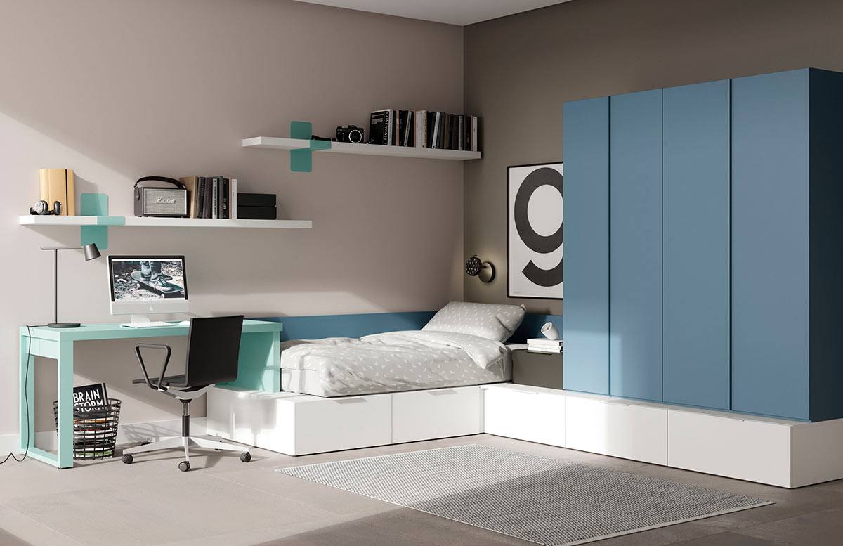 Молодежная спальня с кроватью Kubox. Письменный стол, кровать и шкаф на L из модулей Kubox.