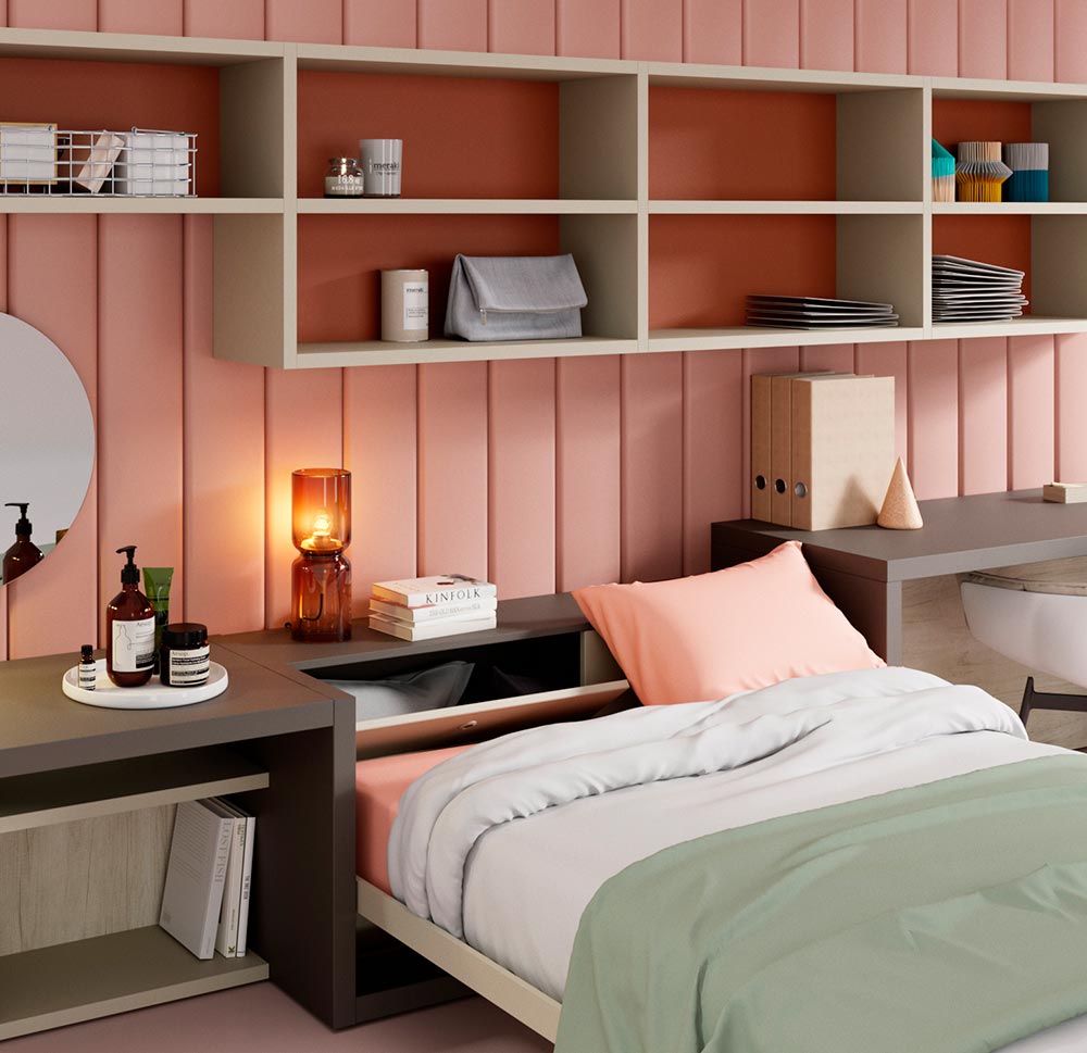 Спальня с раскладной кроватью Blink. Стеллажи Airbox. Зеркало Lifebox Blink и стол.