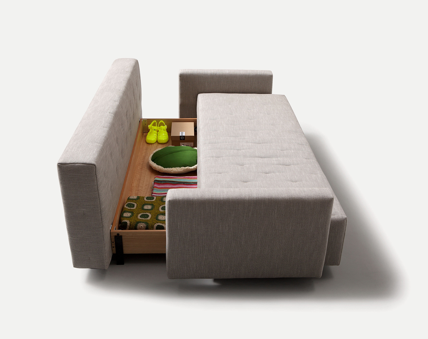 Nap - это диван-кровать, разработанный Рафой Гарсией. Мягкие текстильные детали вдохновлены старинными шерстяными матрасами. Диван имеет удобную мягкую спинку, к которой можно добавить 4 свободные подушки для непринужденной версии или две мягкие подушки для спинки, чтобы создать более домашнюю композицию. За два простых шага нам удалось превратить диван в кровать и наоборот. Скрытый ящик под конструкцией идеально подходит для хранения постельного белья и других вещей. Ящик изготовлен из натурального шпона, а ножки покрыты черным лаком.