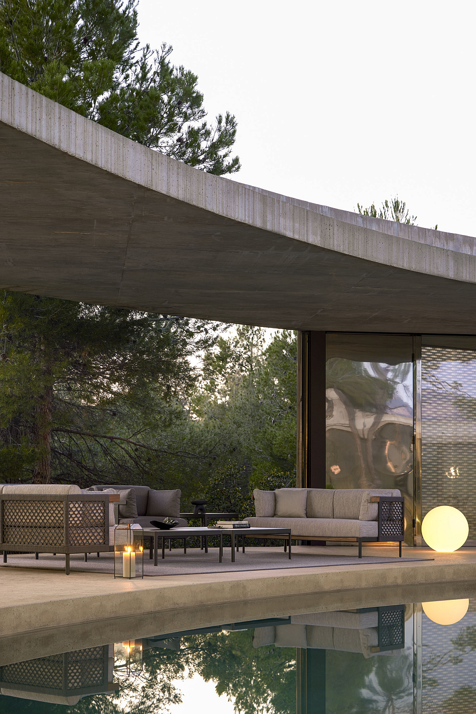 Каркас из алюминия с порошковым покрытием. Спинка оплетена полиэстеровой веревкой толщиной 4 мм. Два варианта отделки: белый алюминий-минерал 34 с бежевой веревкой или серый алюминий-металлик 56 с графитовой веревкой. Подушка сиденья из высокопрочного пенополиуретана весом 35 кг. Ткань для чехлов на подушки вы можете выбрать в разделе «Ткани» при настройке товара на сайте. Вы также можете купить подушки без ткани или из своей ткани. Регулируемые ножки.