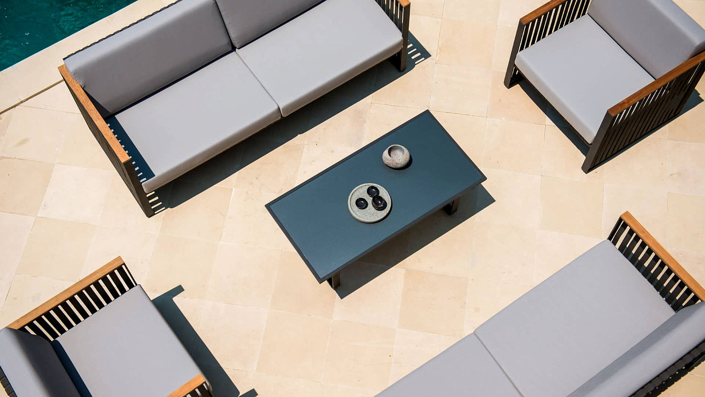 Одна из последних разработок в нашем новом каталоге. Сочетание черного алюминия, темно-серых ремешков и подлокотников из тикового дерева создает универсальную коллекцию, идеально подходящую как городским экстерьерам, так и пространствам для отдыха.