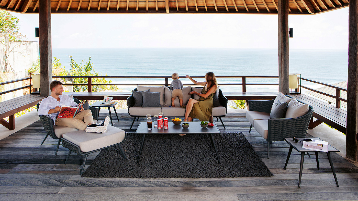 Современные органичные формы из алюминиевой рамы в сочетании с ручной оплёткой из синтетического шнура, делают эту коллекцию идеальным выбором для любого пространства.