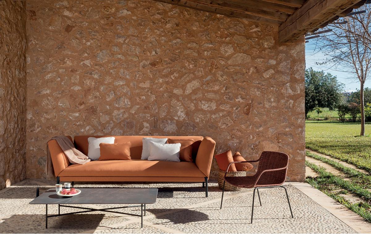 Диван с высоким подлокотником со структурой из высокопрочного алюминиевого профиля и ножками из инжектированного алюминия, отделанными полиэфирным порошком. Богатая палитра разнообразной отделки. Съемная мягкая сидушка.