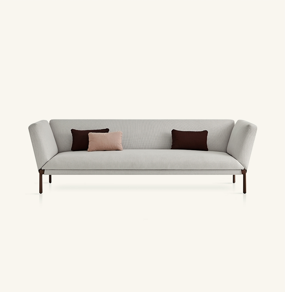 Диван с высокими подлокотниками со структурой из высокопрочного алюминиевого профиля и ножками из литьевого алюминия, обработанного порошковой полиэфирной краской. Возможность индивидуальной настройки благодаря широкому выбору технических тканей, полностью подходящих для использования на открытом воздухе. Съемный мягкий чехол.