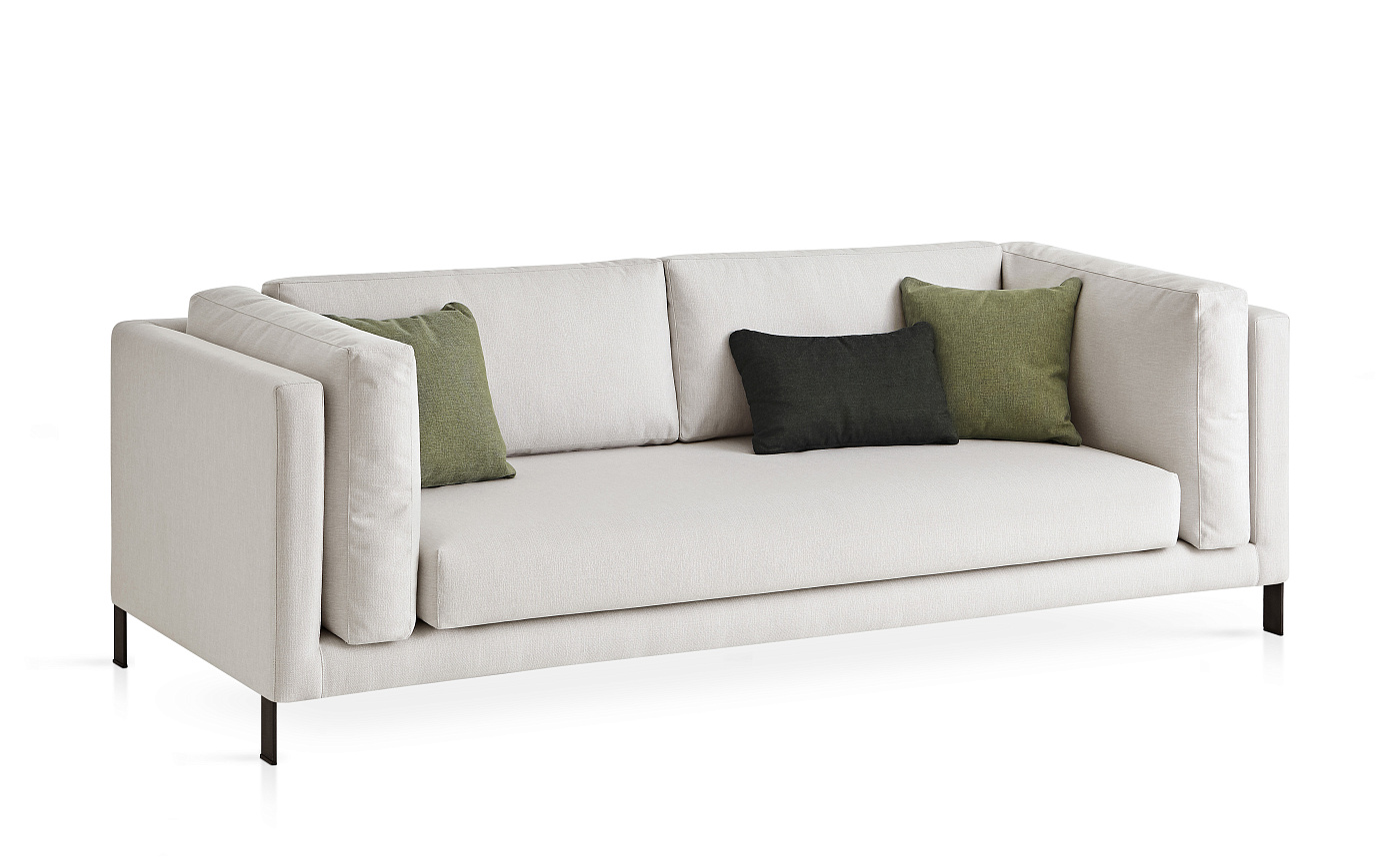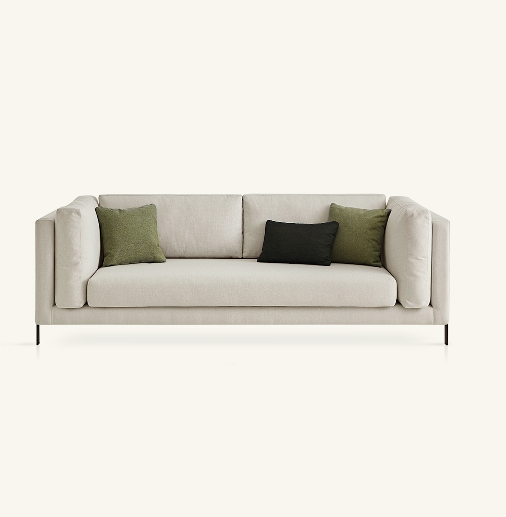 Диван со структурой из высокопрочного алюминия, покрытого QuickDryFoam®. Возможность изготовления на заказ из разнообразных технических тканей соответствующих для наружного использования. Ножки из нержавеющей стали.