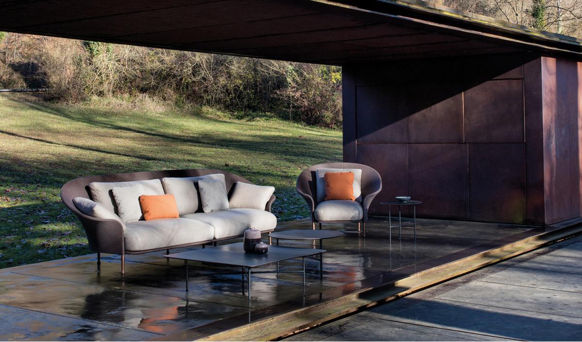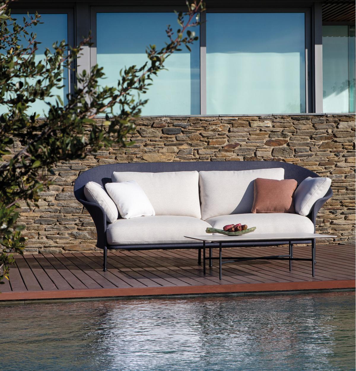 Диван со структурой из высокопрочной алюминиевой трубы и литыми алюминиевыми ножками. Возможность индивидуальной настройки благодаря широкому выбору технических тканей, полностью подходящих для использования на открытом воздухе.