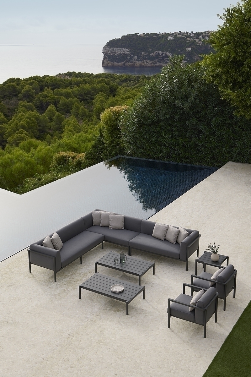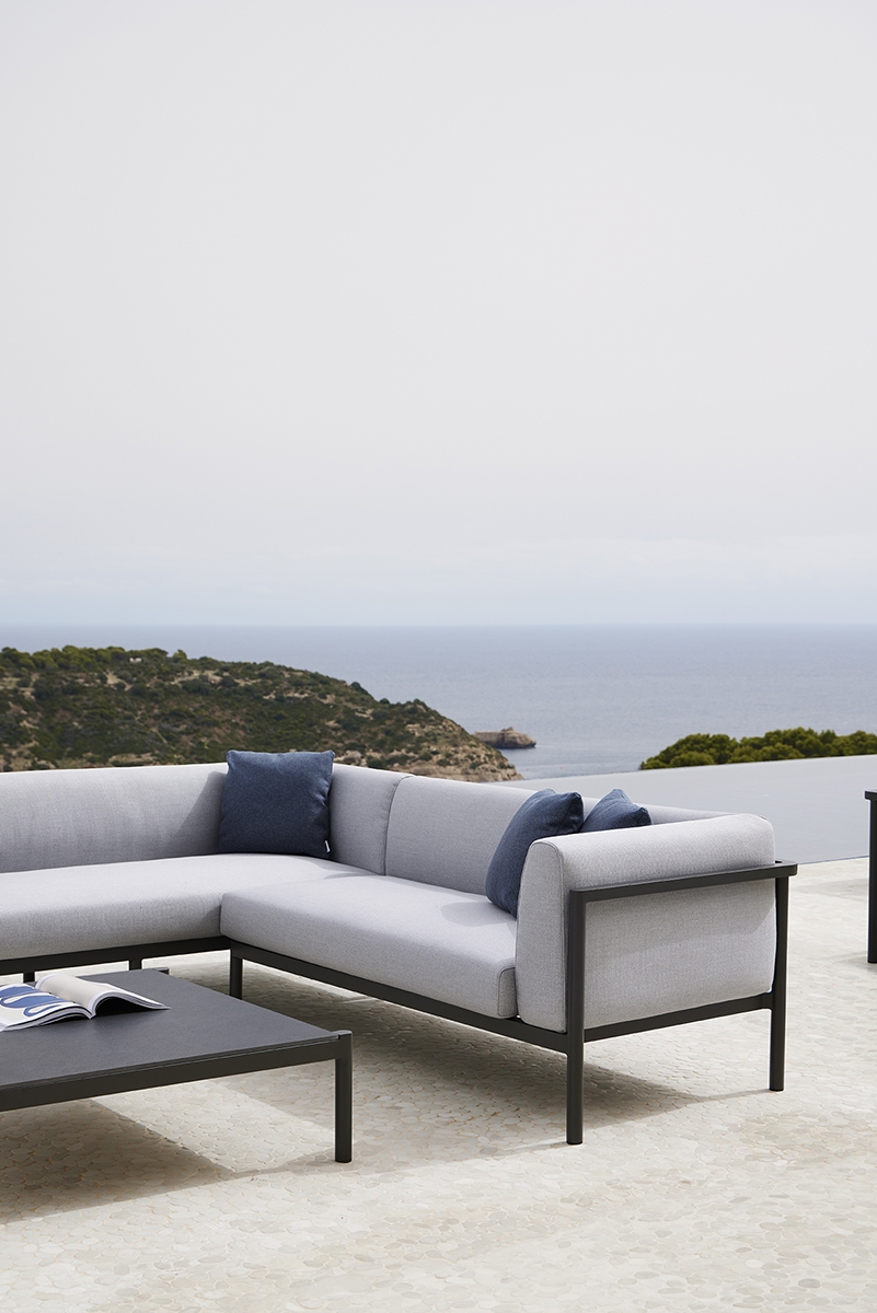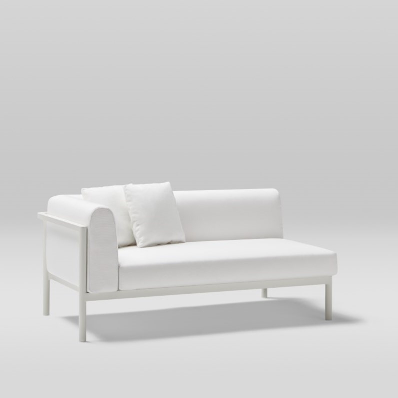 Секционный диван под правую руку 2. Алюминиевая конструкция с порошковым покрытием доступна в цветах Кремовый 34 и Серый 56. Подушка сиденья и спинки из высокопрочного пенополиуретана весом 35 кг. Ткань для чехлов на подушки можно выбрать из различных тканей при настройке продукта на сайте. Вы также можете приобрести подушки без ткани или с собственной тканью.