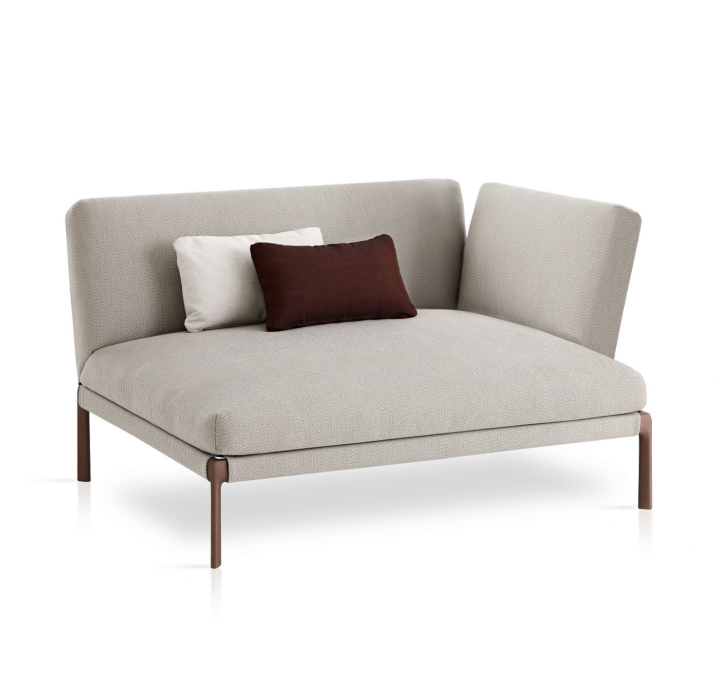 Правый боковой модуль с высоким подлокотником, конструкция которого изготовлена из высокопрочного алюминиевого профиля, а ножки из литого алюминия покрыты полиэфирной порошковой краской. Возможность персонализации благодаря широкому выбору технических тканей, полностью подходящих для использования на открытом воздухе. Съемный мягкий чехол.
