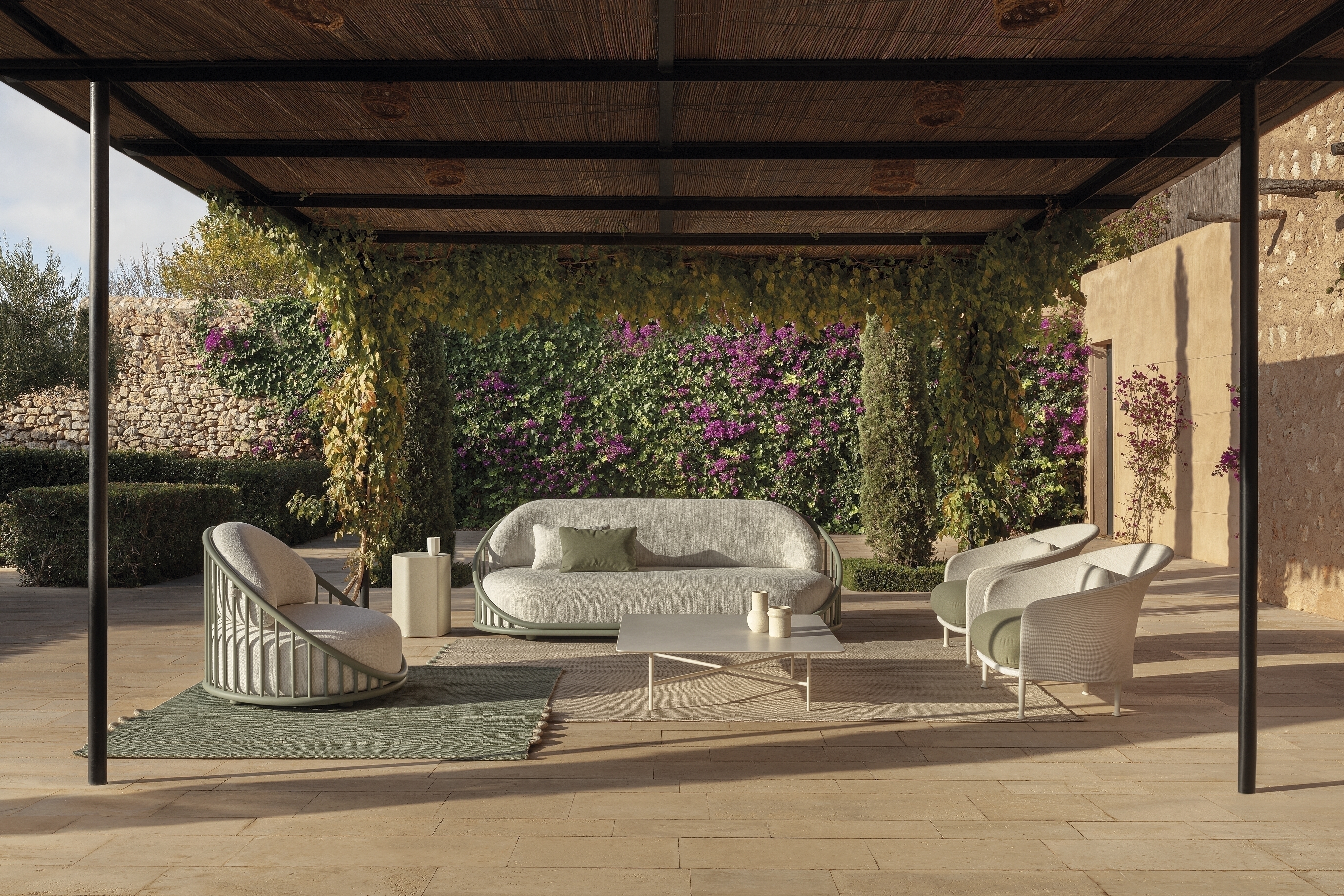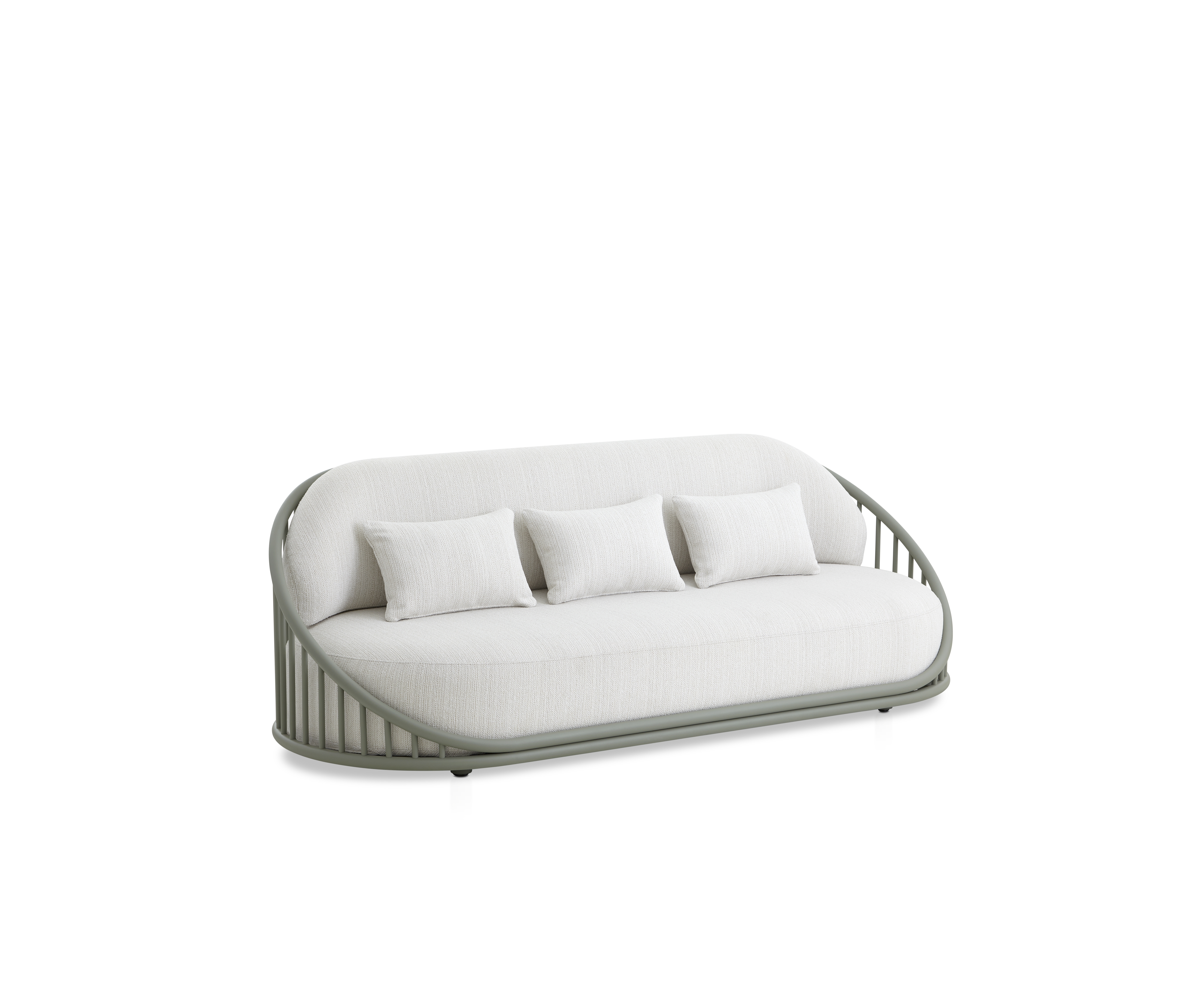 Диван изготовлен из высокопрочной алюминиевой трубы. Возможность персонализации благодаря широкому выбору технических тканей, полностью подходящих для использования на открытом воздухе.