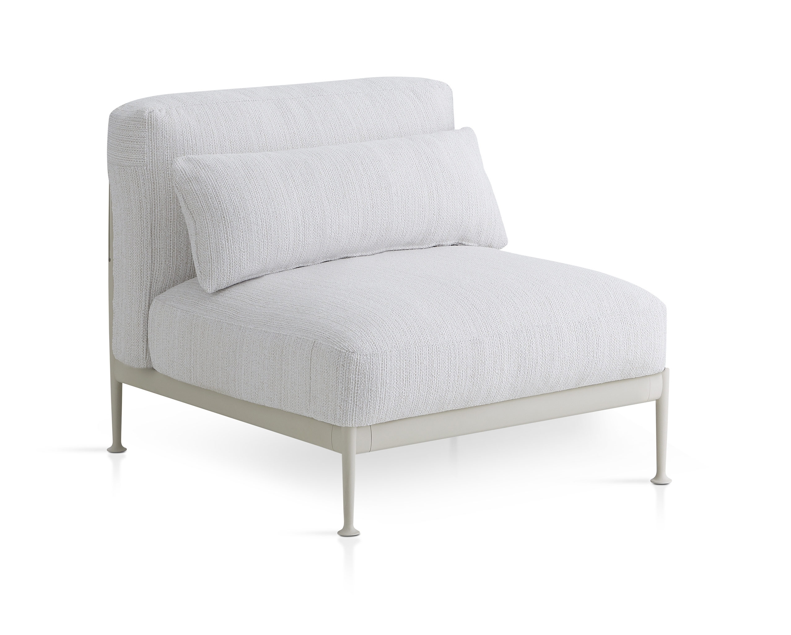 Модуль с конструкцией из высокопрочного алюминиевого профиля и ножками из литого алюминия, покрытого полиэфирной порошковой краской. Ремень из технической ткани Zander. Возможность персонализации благодаря широкому выбору технических тканей, полностью подходящих для использования на открытом воздухе.