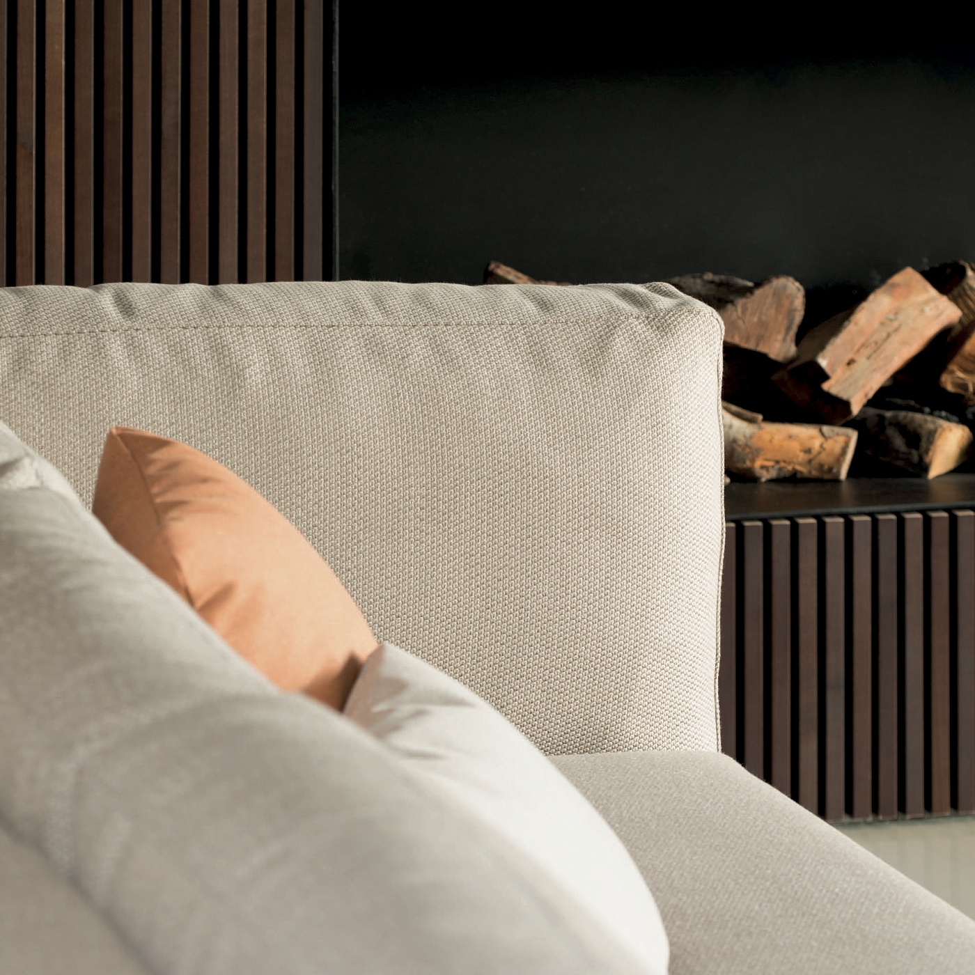 Угловой модуль со структурой из высокоомного алюминия, покрытого QuickDryFoam®. Возможность настройки с помощью широкого спектра технических тканей, полностью подходящих для наружного использования. Ножки из нержавеющей стали.