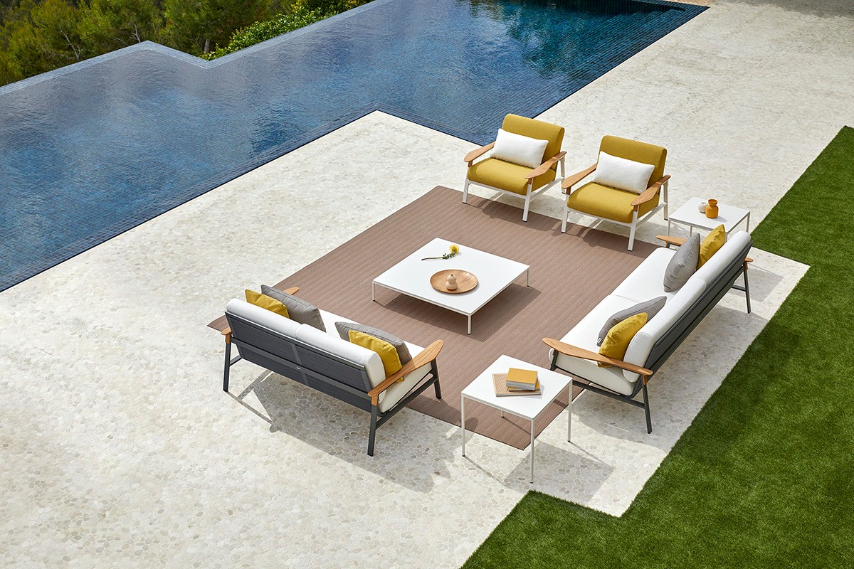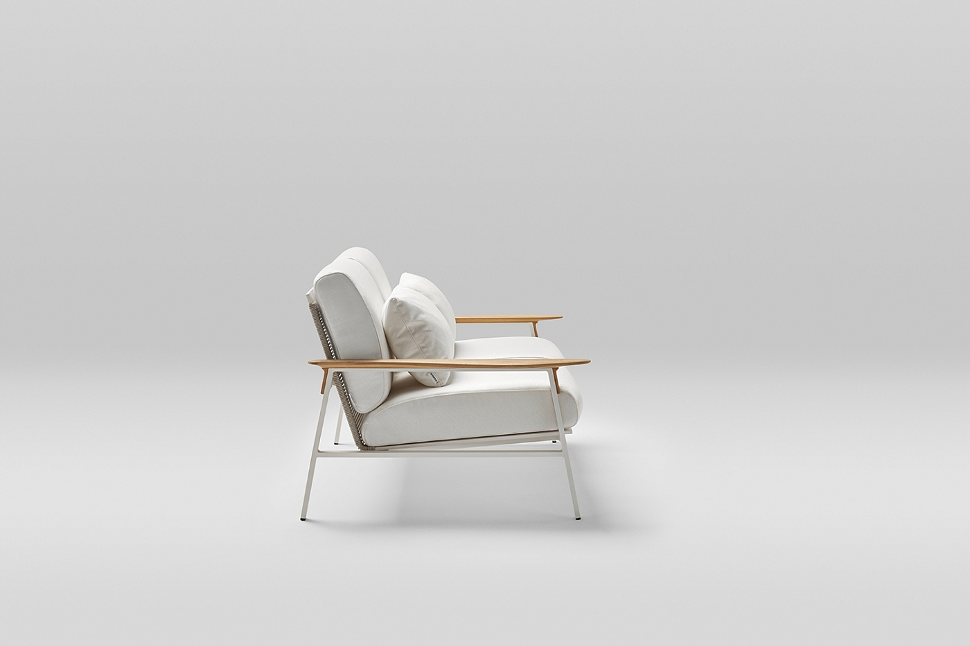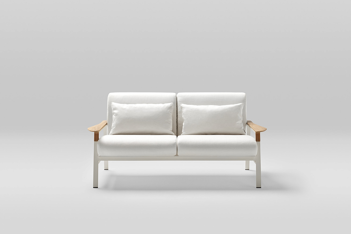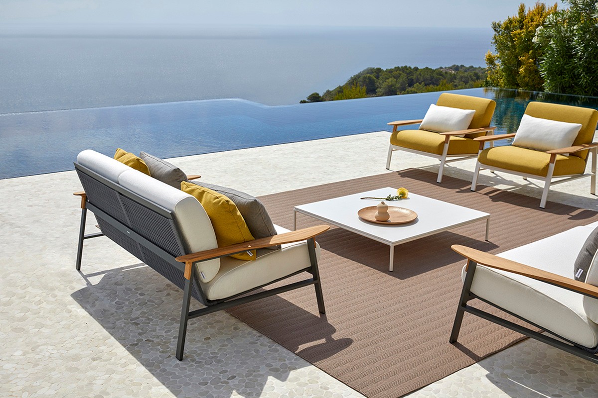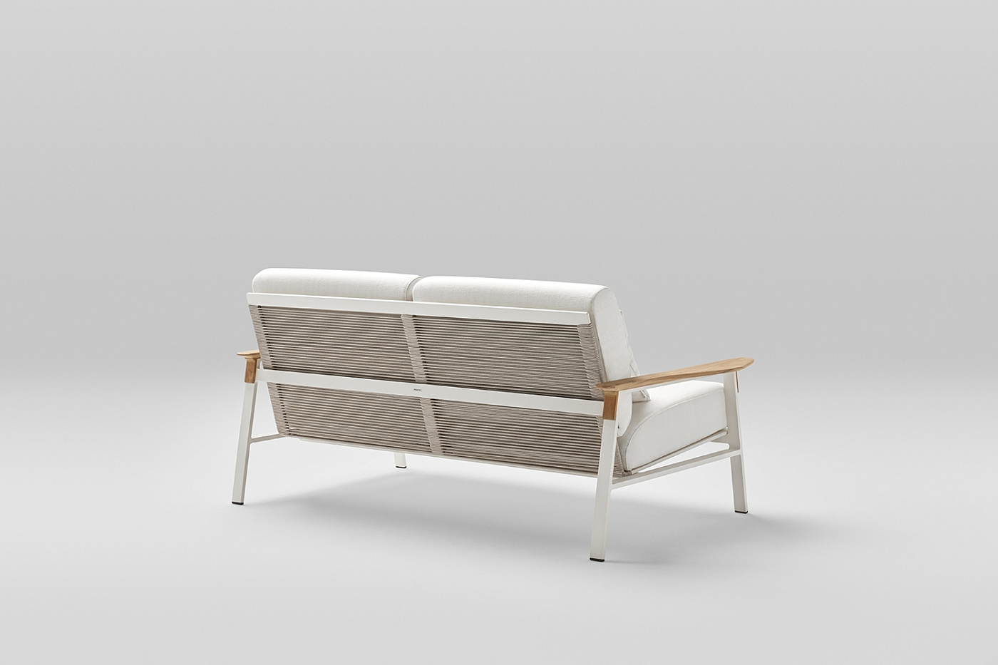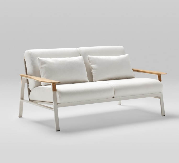 2-местный диван с алюминиевой рамой с порошковым покрытием и подлокотниками из тикового дерева. Спинка сплетена из полиэфирной веревки толщиной 4 мм. Три варианта отделки: кремовый алюминий 34 с бежевым тросом, песочный алюминий 74 с жемчужно-серым тросом или металлический серый алюминий 56 с графитовым тросом. Подушка сиденья и спинки из высокопрочного пенополиуретана 35 кг. Подушки сидений изготовлены по технологии реечной подвески GOODSIDE, которая в сочетании с пеной обеспечивает высокую устойчивость и удобство сиденья. Подушки с этой системой всегда имеют водонепроницаемое покрытие. Ткань для чехлов на подушки можно выбрать в разделе «Ткани» при настройке продукта на веб-сайте. Вы также можете приобрести подушки без ткани или с собственной тканью.
