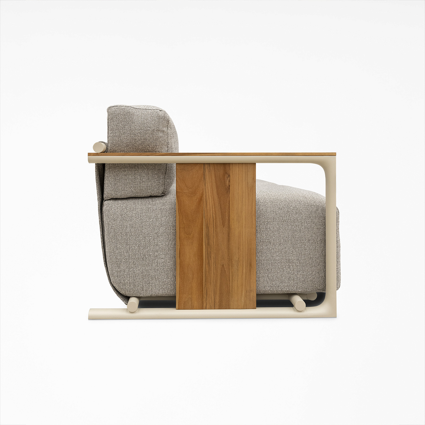 Eugeni Quitllet объединяет высококачественные материалы и передовые технологии в этом двухместном диване. Благодаря алюминиевым профилям, обработанным эпоксидной краской и точной сварке, деталям из индонезийского тикового дерева, обивке разной плотности и съемной ткани спинки, Tulum сочетает в себе комфорт и долговечность. Эта дизайнерская коллекция мебели представляет собой элегантную гармонию натуральных материалов и технологий, идеально подходит для использования в помещении и на открытом воздухе.