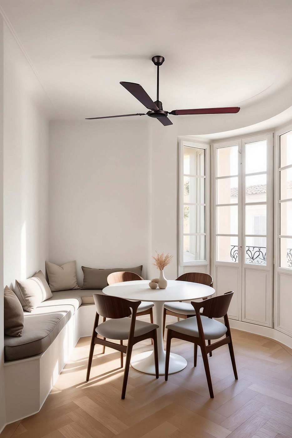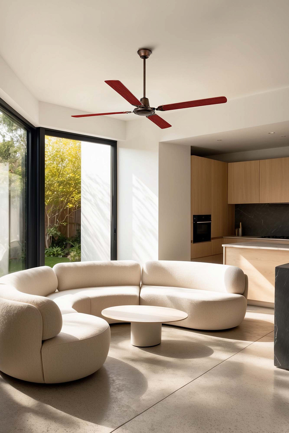 Современные линии потолочного вентилятора идеально подходят для помещений от 17,6м2. Двигатель изготовлен из стали и лопасти из фанеры. Отделка лезвий - красное дерево и красное дерево, они регулируются. Питание от настенного регулятора, в комплекте. Он имеет 5 регулируемых скоростей с потреблением 24-37-48-57-80 Вт и 111-145 -170-187-229 оборотов в минуту в зависимости от скорости. Этот вентилятор имеет обратную функцию. Подходит для скатной кровли.