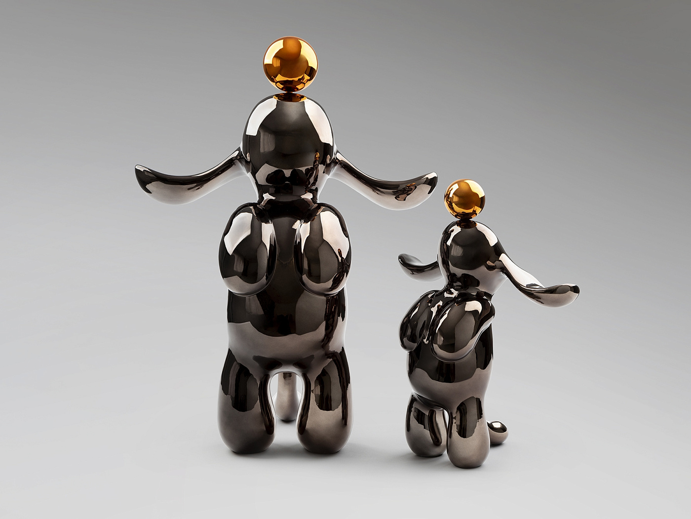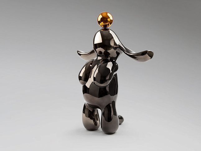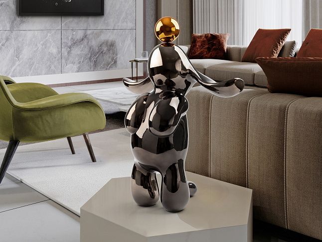 Круглая фигурка кролика среднего размера. Изготовлена из смолы, покрыта металлическим свинцово-серым и оранжевым цветом.