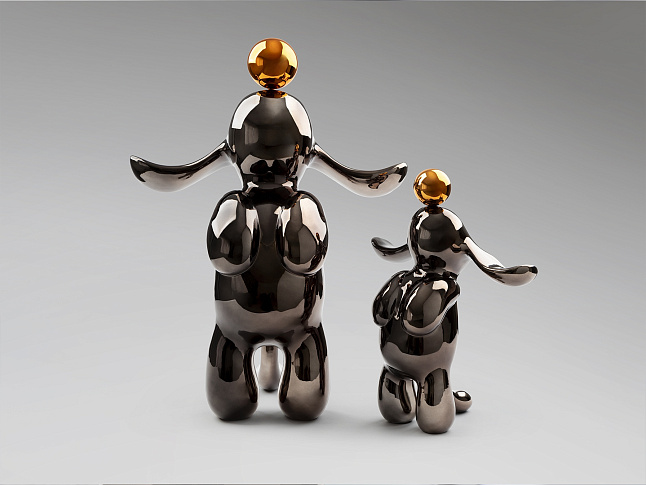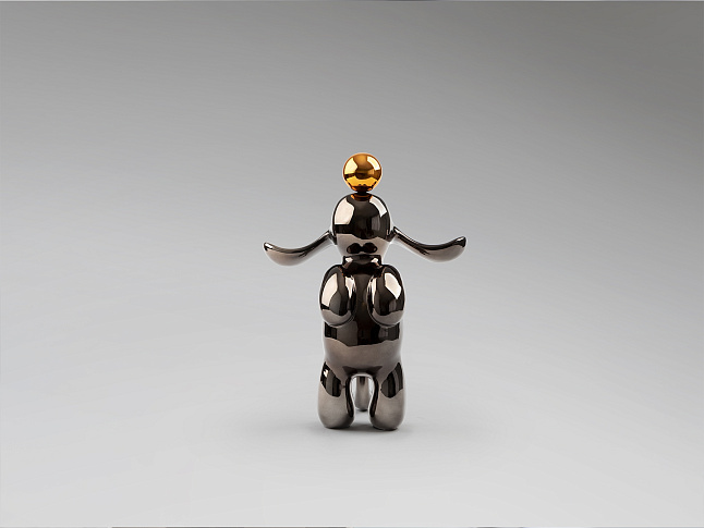 Круглая фигурка кролика, небольшого размера. Изготовлена из смолы, покрыта металлическим свинцово-серым и оранжевым цветом.
