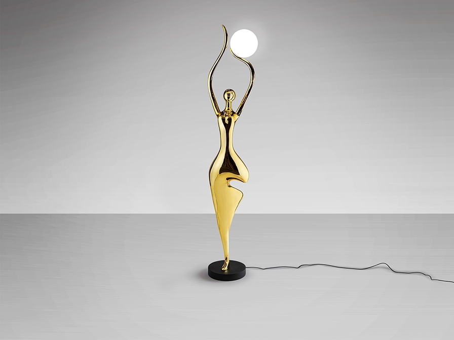 Фигурка изготовлена из стекловолокна и полиэфирной смолы, покрыта ярким золотом и имеет матово-черное металлическое основание. Сферический акриловый абажур с матово-опаловой отделкой. ·В комплект поставки входит 1 светодиод G9 мощностью 6 Вт.
