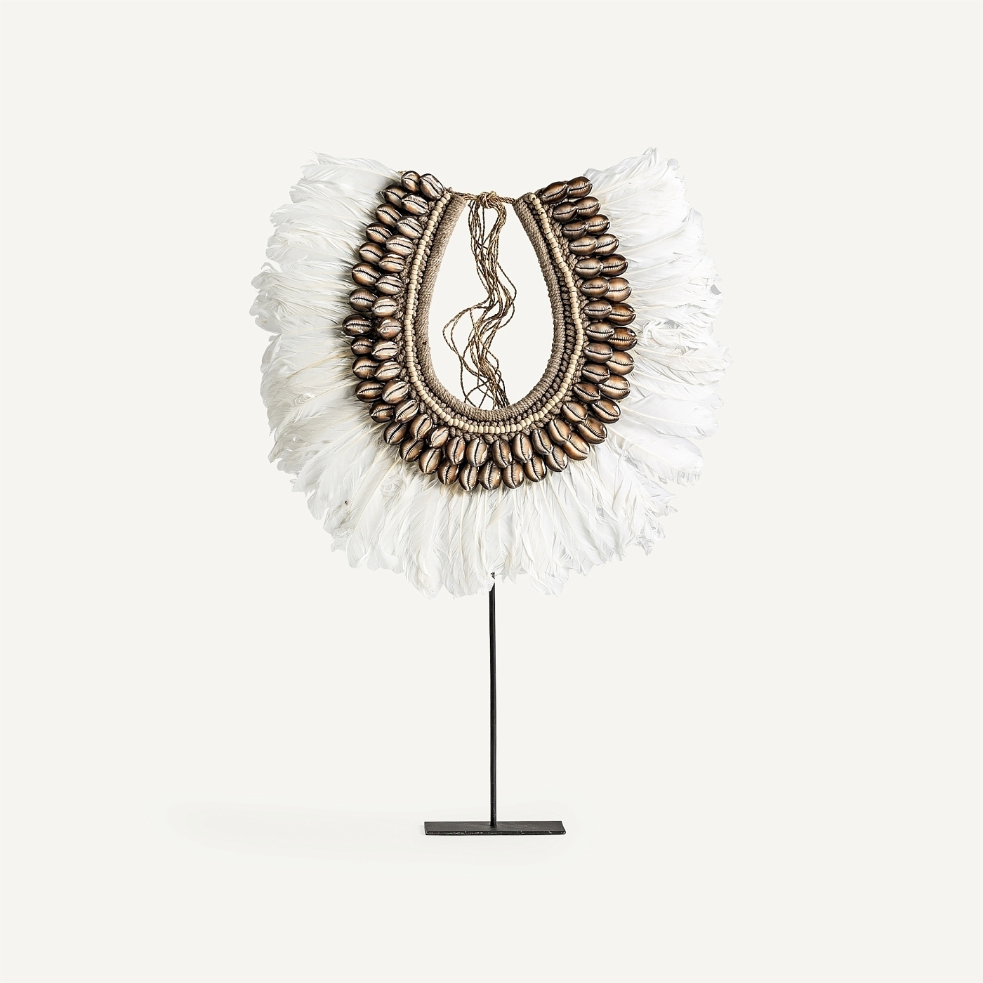 Фигурка в этническом стиле, выполненная из белого железа в сочетании с коричневой раковиной и перьями. Изделие разборное. Ширина: 45 см, Глубина: 10 см, Высота: 60 см
