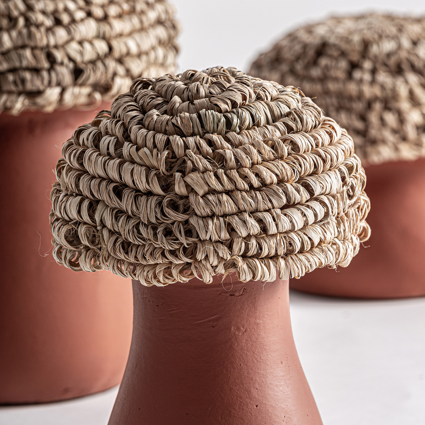 Фигура j/3, выполнена из терракоты терракотового цвета в сочетании с бежевой рафией. БОЛЬШОЙ Ширина: 23 см, Глубина: 23 см, Высота: 28 см СРЕДНИЙ Ширина: 18 см, Глубина: 18 см, Высота: 27 см МАЛЕНЬКИЙ Ширина: 23 см, Глубина: 23 см, Высота: 20 см