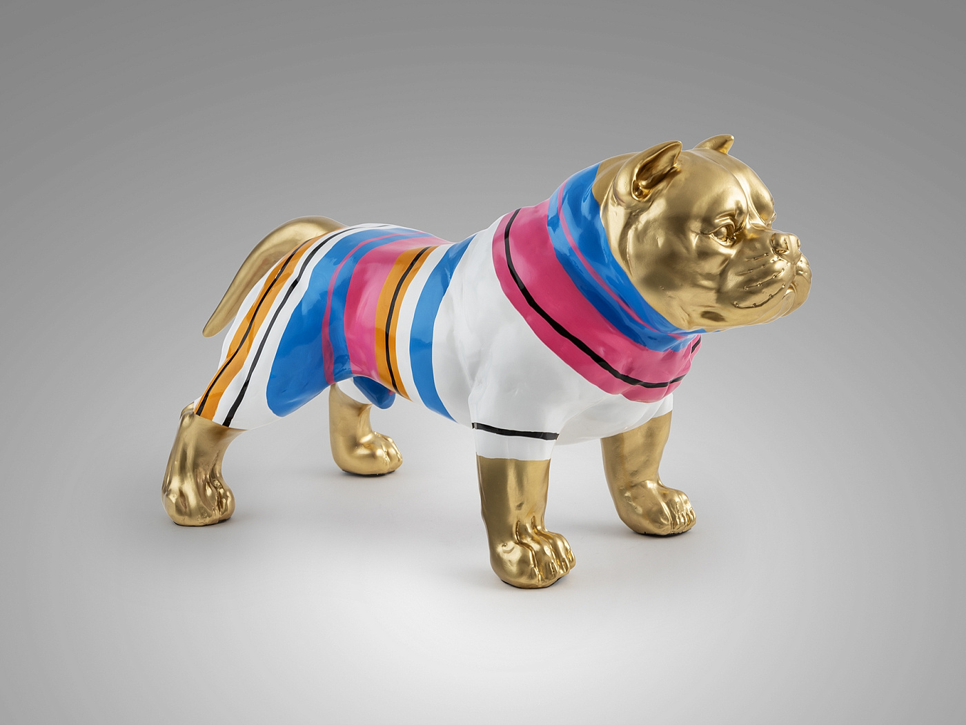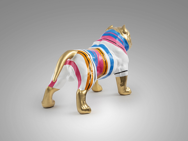 Фигурка Питбуля среднего размера, изготовлена из смолы. Оформление: золотая краска с цветными полосками.