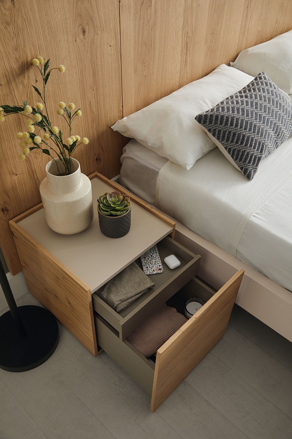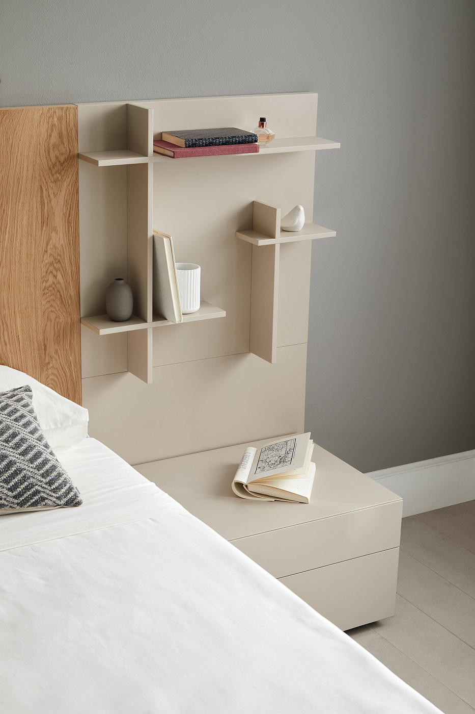 Доан дает волю вашему воображению. Панели можно комбинировать тысячей и одним способом. Эта свобода композиции усиливается возможностью персонализировать каждый предмет с помощью полок, образующих практически невозможные геометрические формы. Предпочитаете ли вы порядок и покой или вас больше привлекают асимметричные неровности в вашей спальне, Doan может предложить вам идеальное решение. Большое разнообразие размеров и отделки открывает мир очень интересных возможностей.