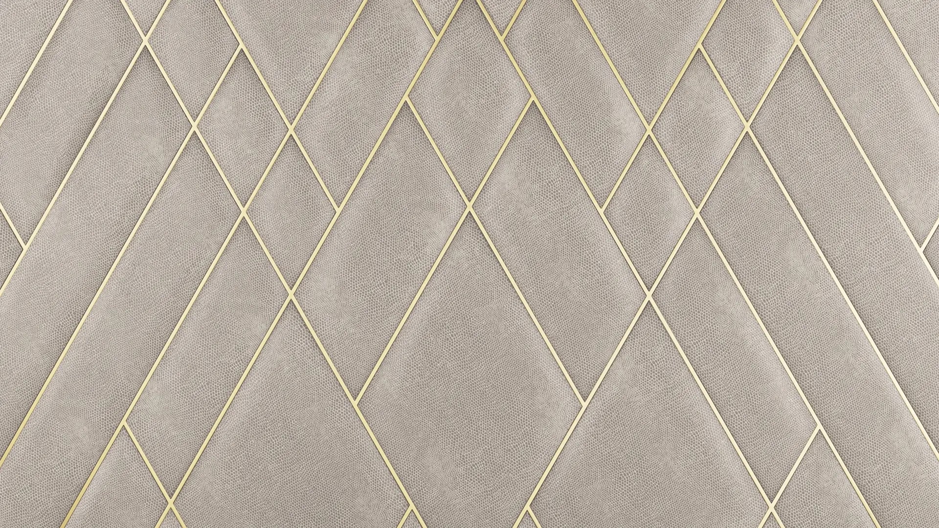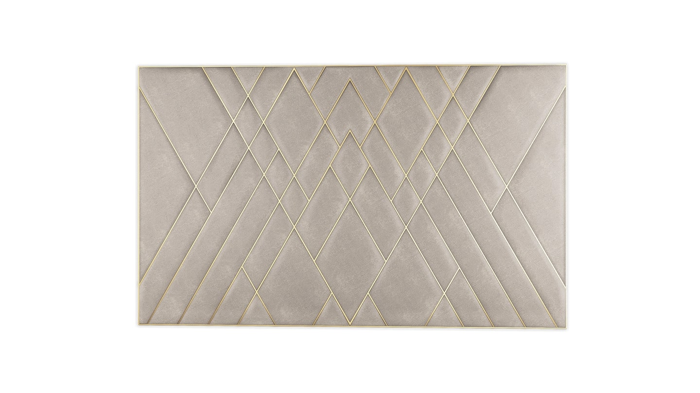 Изголовье кровати HERVÉ прямоугольной формы с четкими линиями обтянуто кожей и украшено замысловатым ромбовидным рисунком, выполненным из матовой латуни.