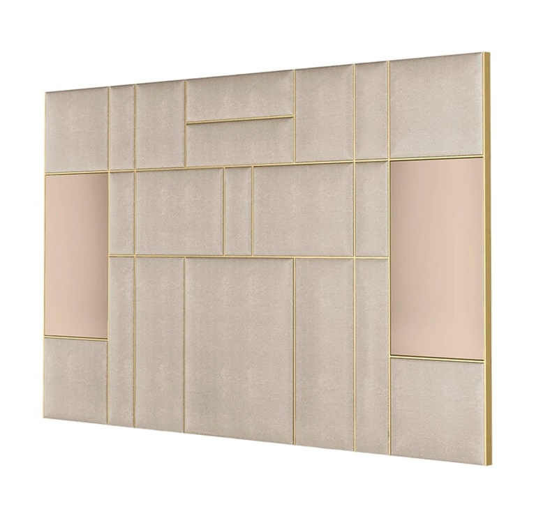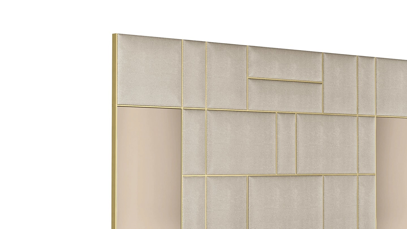 Очаровательное изголовье кровати LOUISIANA, напоминающее абстрактное произведение искусства, украшено мягкими кожаными вставками, швами из матовой латуни и, что самое уникальное, двумя секциями бронзового зеркала.