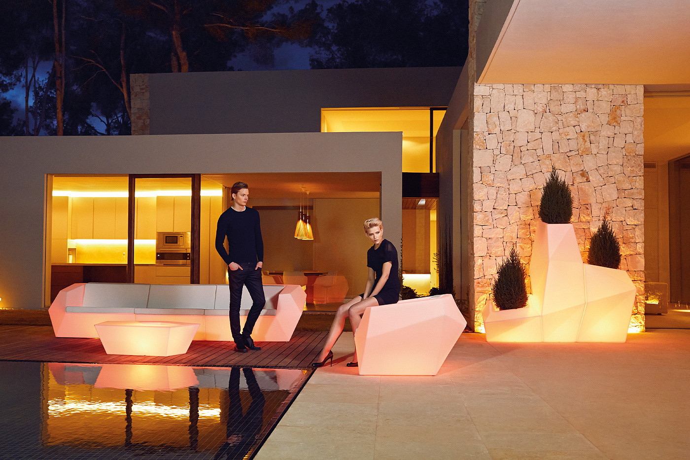 Коллекция FAZ, созданная для компании Vondom всемирно известным испанским дизайнером Рамоном Эстеве (Ramon Esteve), включает в себя модульный диван, два кресла, пару небольших столиков, модульную скамейку, кровать lounge и комплект из трех кашпо. Основным мотивом дизайна коллекции стала кристаллическая структура натуральных минералов, которая создает удивительную атмосферу из бликов и отражений. Причудливая игра света и теней порождает ощущение некоего органического порядка, странную иллюзию существования волшебного мира и иной реальности.