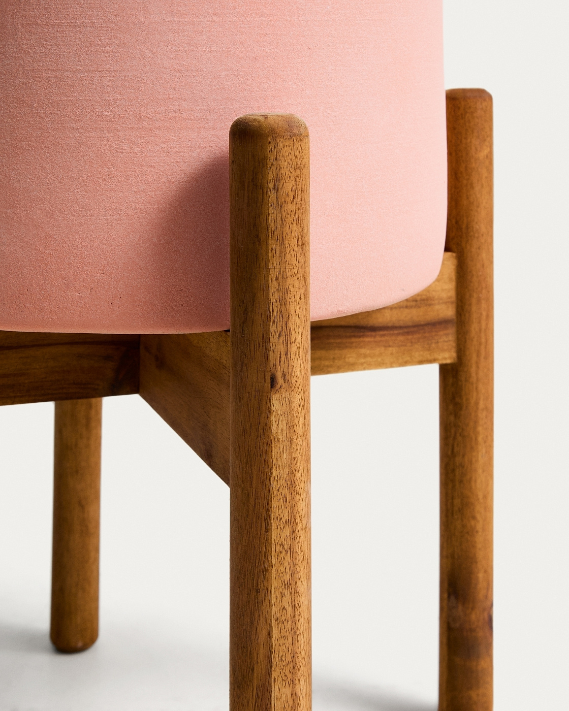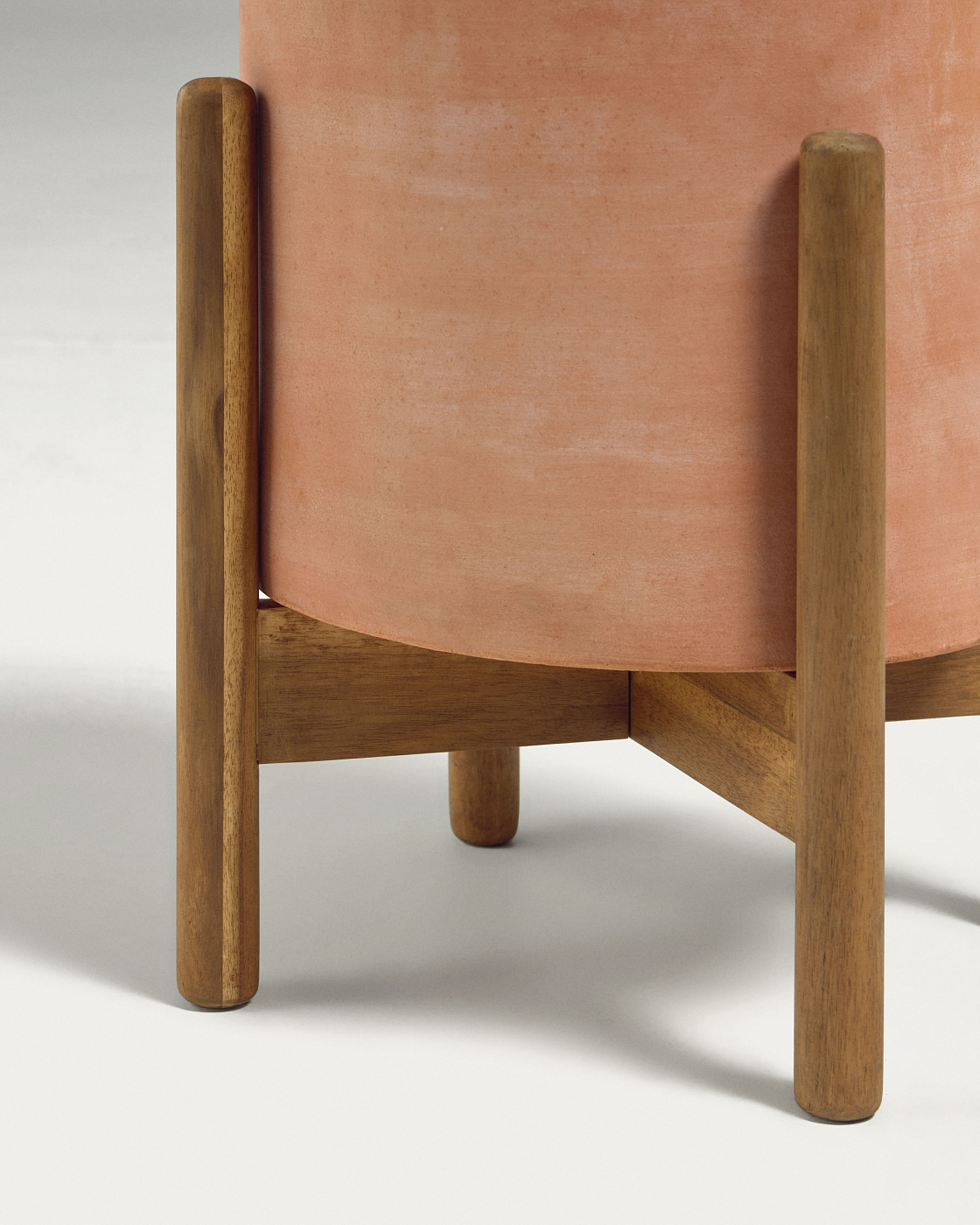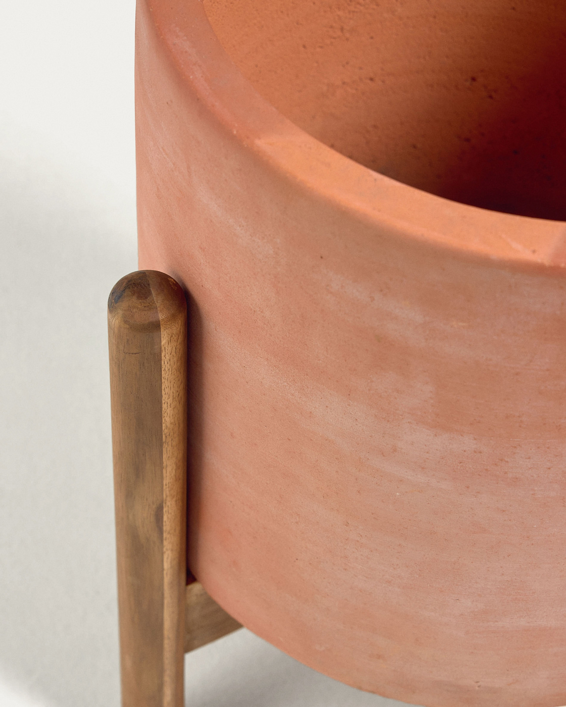 Кашпо состоит из глиняного горшка в натуральной отделке и деревянной стойки.