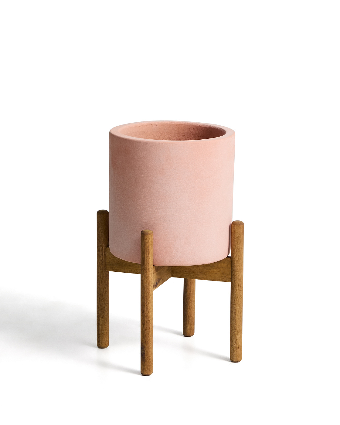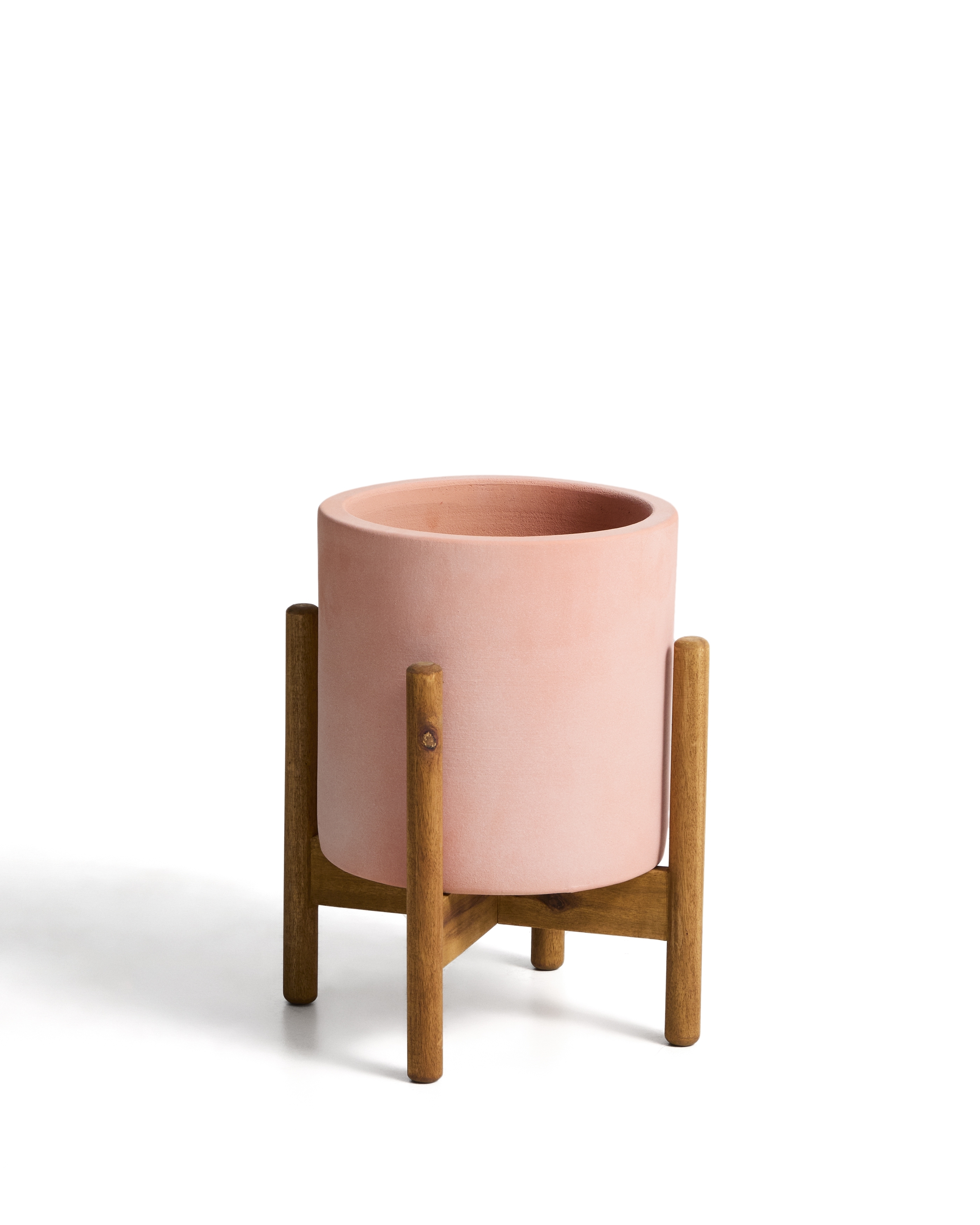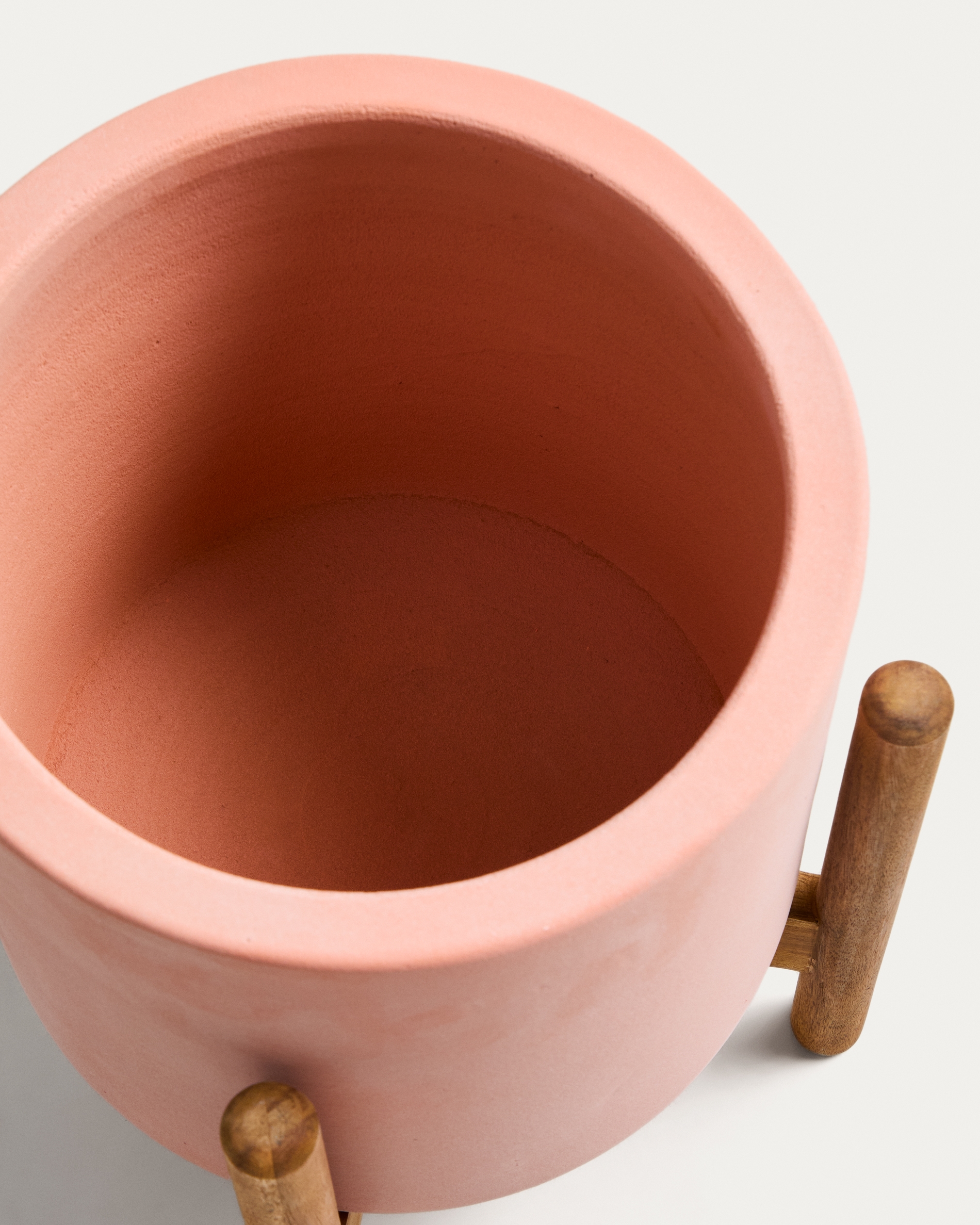 Кашпо состоит из глиняного горшка в натуральной отделке и деревянной стойки.