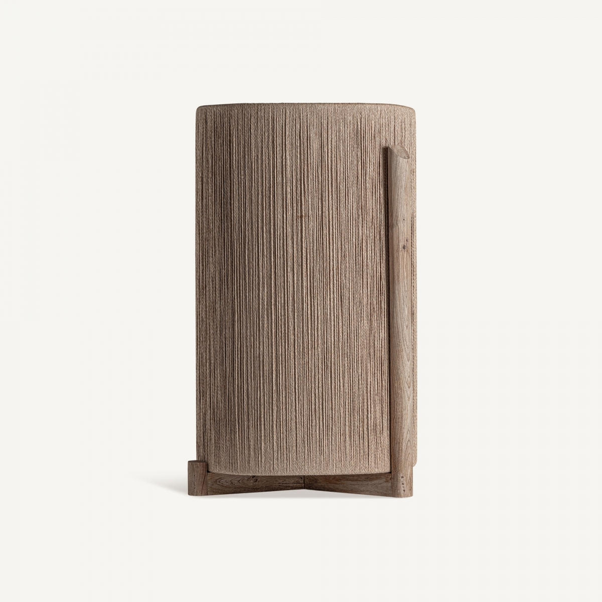 Современное кашпо. Изготовлено из коричневого мангового дерева в сочетании со светло-коричневой рафией.