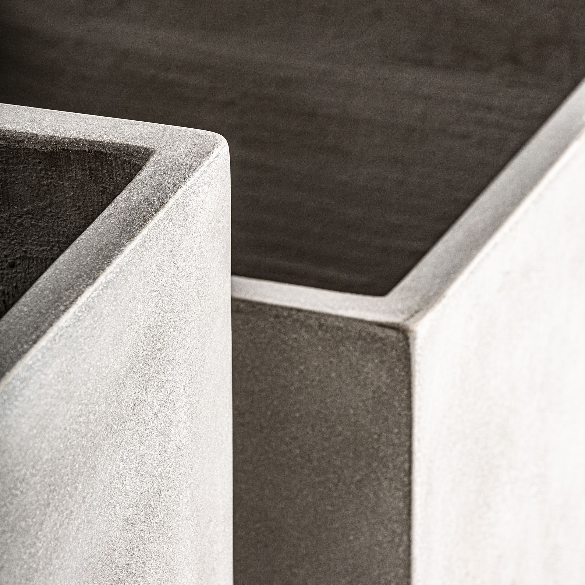Набор из 2 кашпо в современном стиле, выполнен из серой терракоты. Большая ширина: 70 см, Глубина: 70 см, Высота: 70 см Маленькая ширина: 56 см, Глубина: 56 см, Высота: 56 см