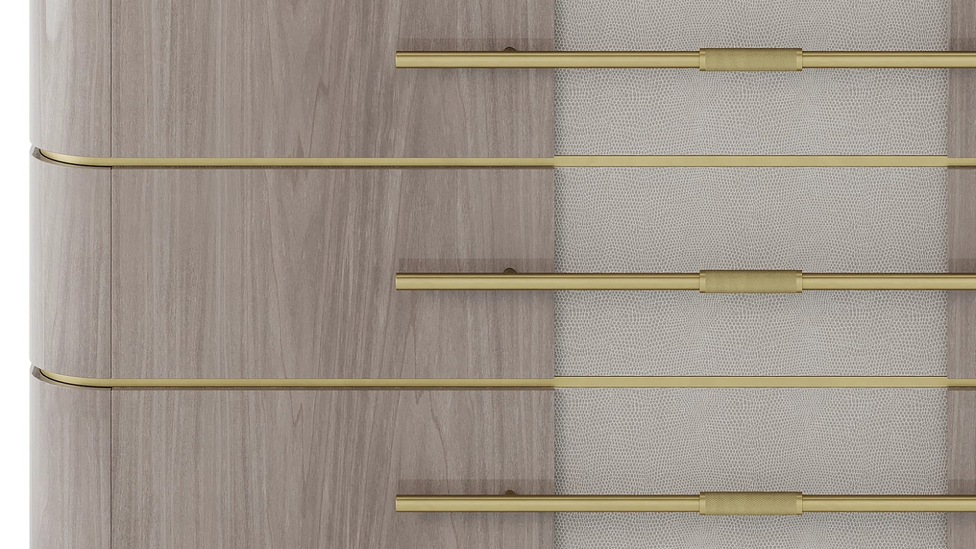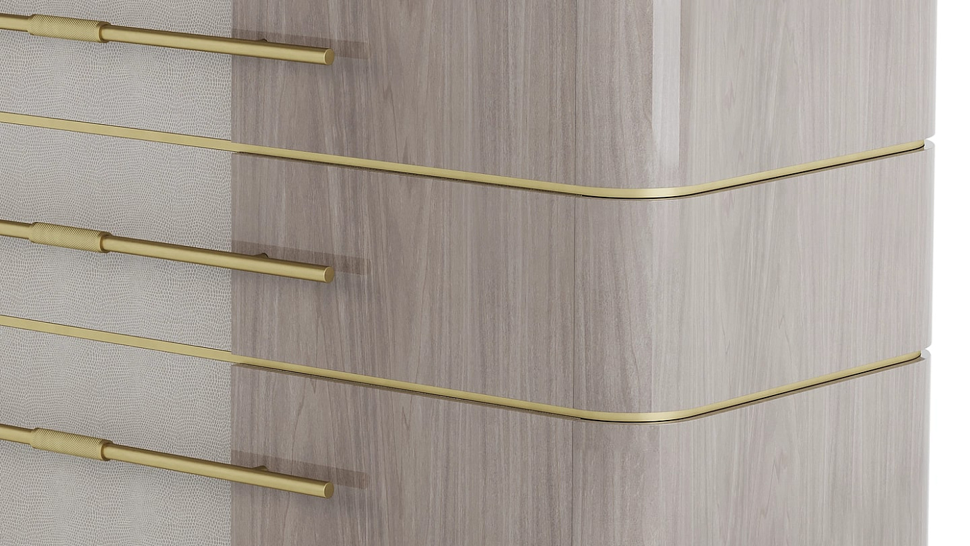 Комод AGRA, изготовленный из деревянного шпона, подчеркивает свой солидный силуэт вставками из матовой латуни, удлиненными ручками и панелями из тактильной кожи. Шесть выдвижных ящиков, обеспечивающих превосходную отделку, изнутри обшиты сверхмягкой замшей.