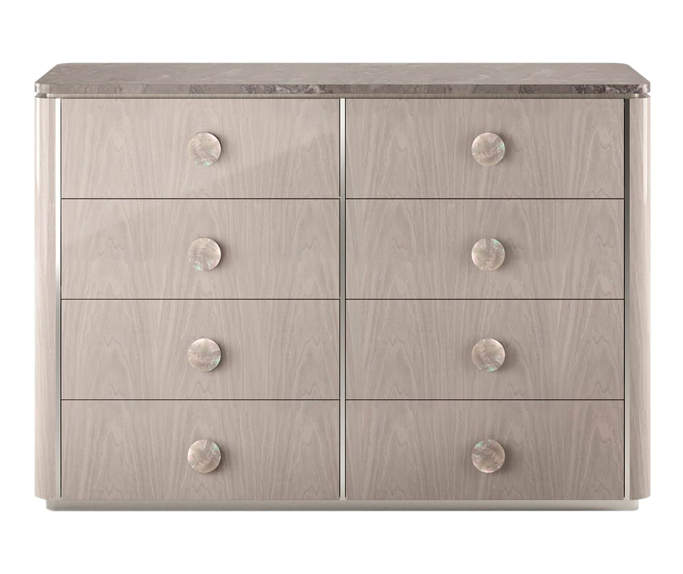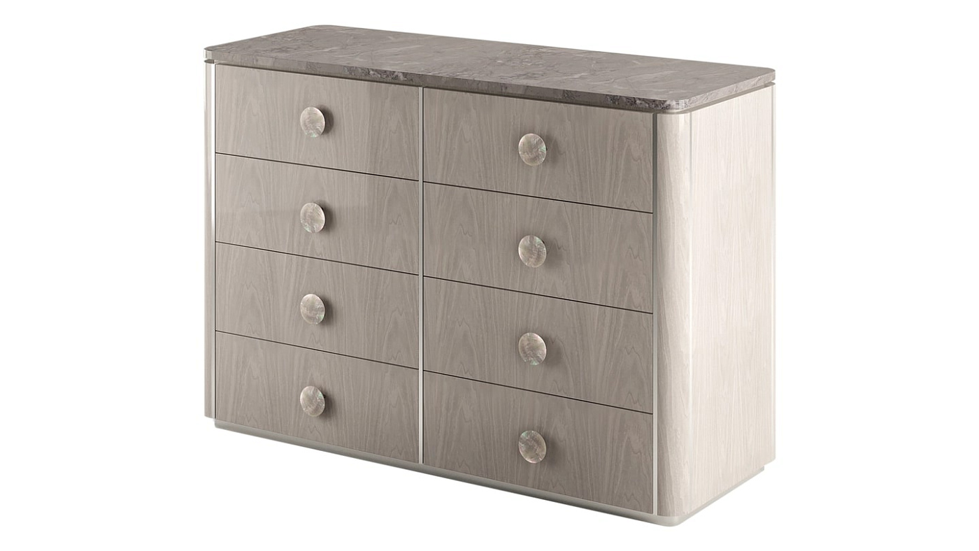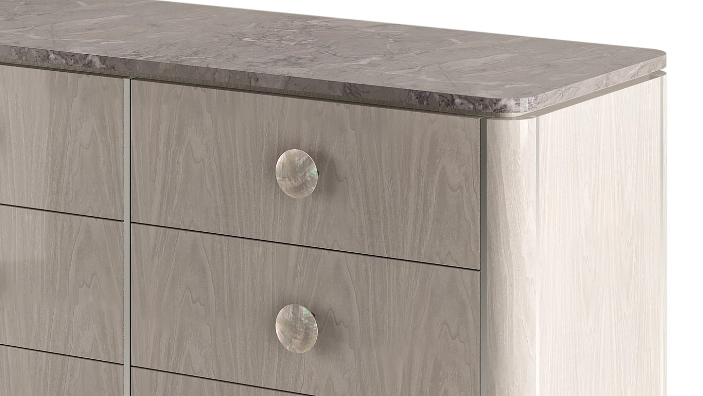 "Серые тона привносят гармонию в разнообразие оттенков патины, из которых состоит архетипический комод BERNA. Сочетающий в себе древесный шпон с прожилками, пеструю каменную поверхность и черные перламутровые ручки, его силуэт подчеркнут вставками из полированной нержавеющей стали. "