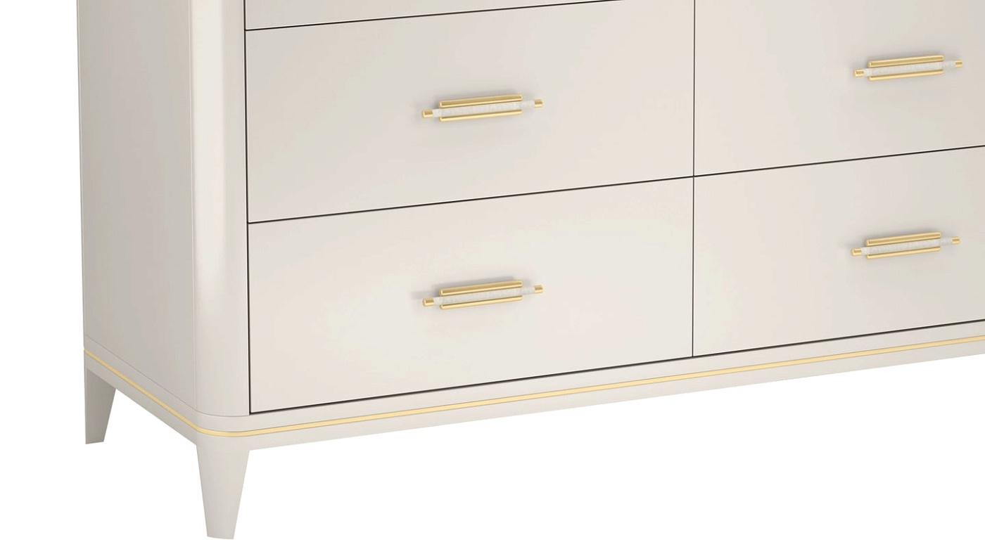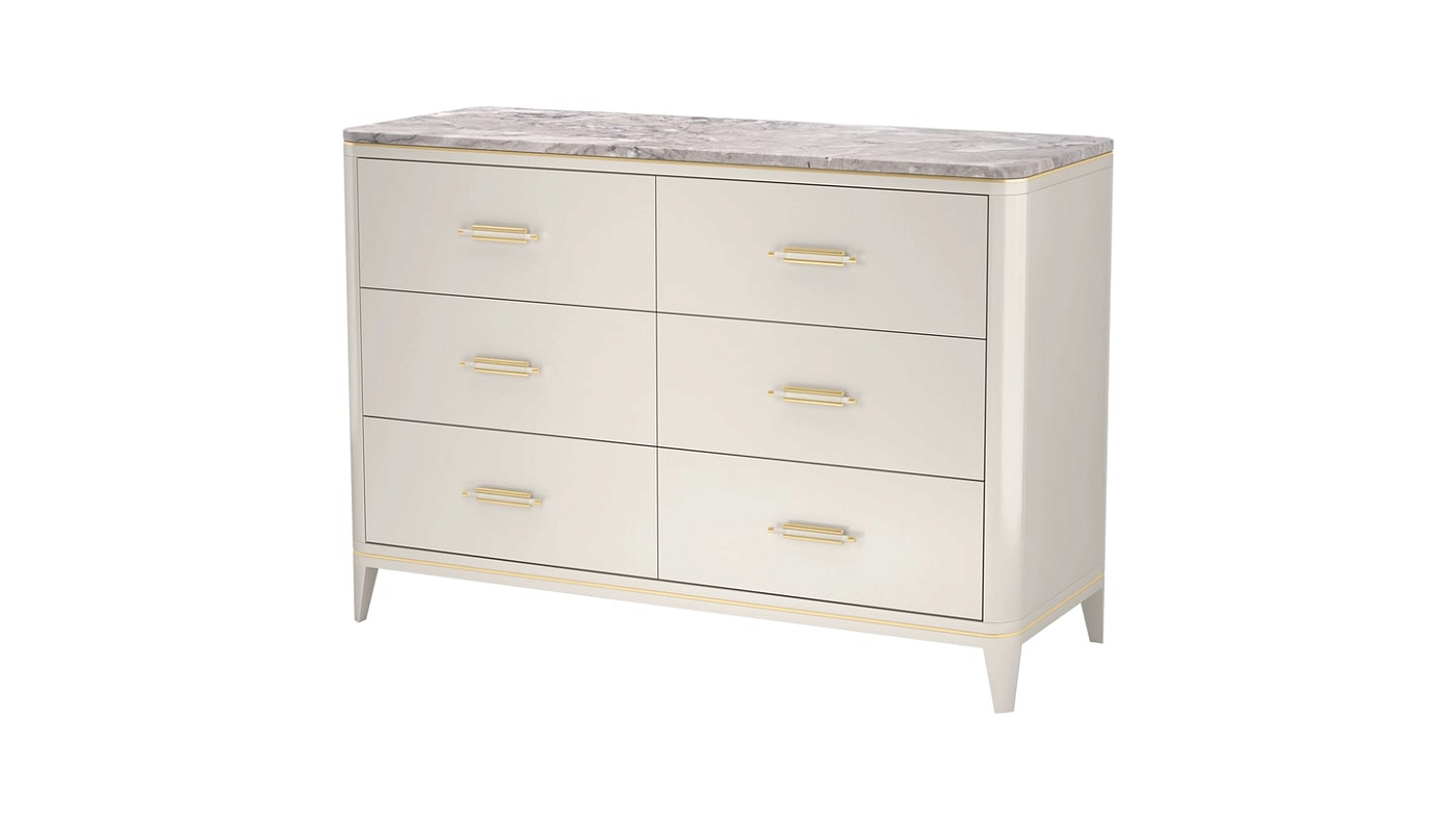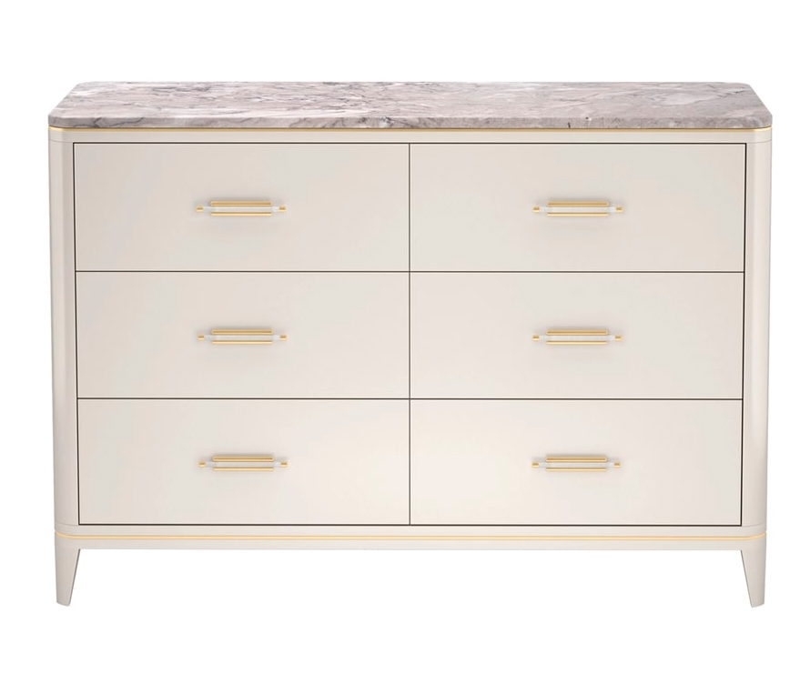 Классический комод CLICQUOT design включает в себя шесть отделанных замшей выдвижных ящиков, украшенных скульптурными ручками из матовой латуни и кожи. Выполненный из глянцевого лака, дизайн дополнен богато патинированным кусочком камня.