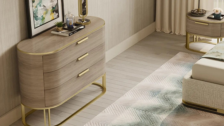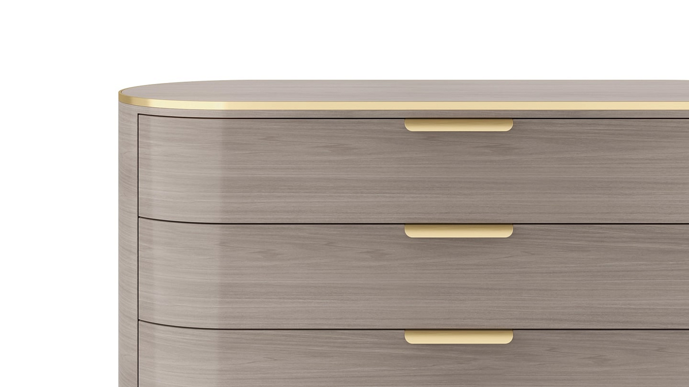 Плавно изогнутый продолговатый комод DALLAS с извилистым дизайном ящиков выполнен из глянцевого шпона с акцентами и архитектурным основанием из контрастной матовой латуни. Три выдвижных ящика снабжены простыми выдвижными ручками и открываются, открывая внутреннюю отделку из замши.