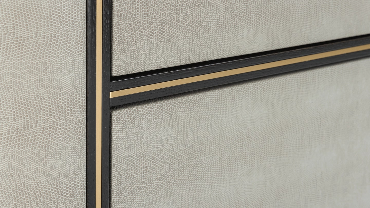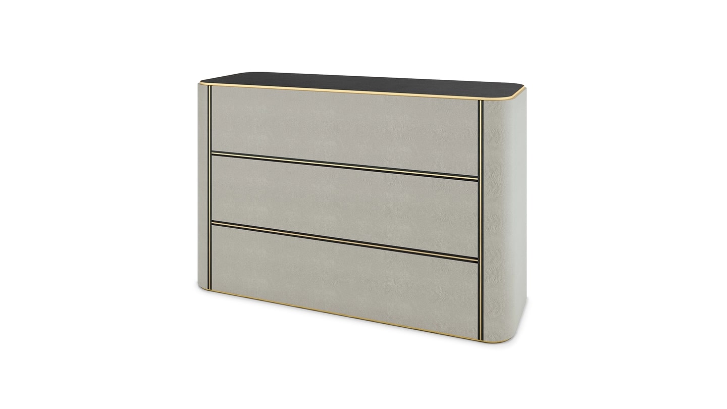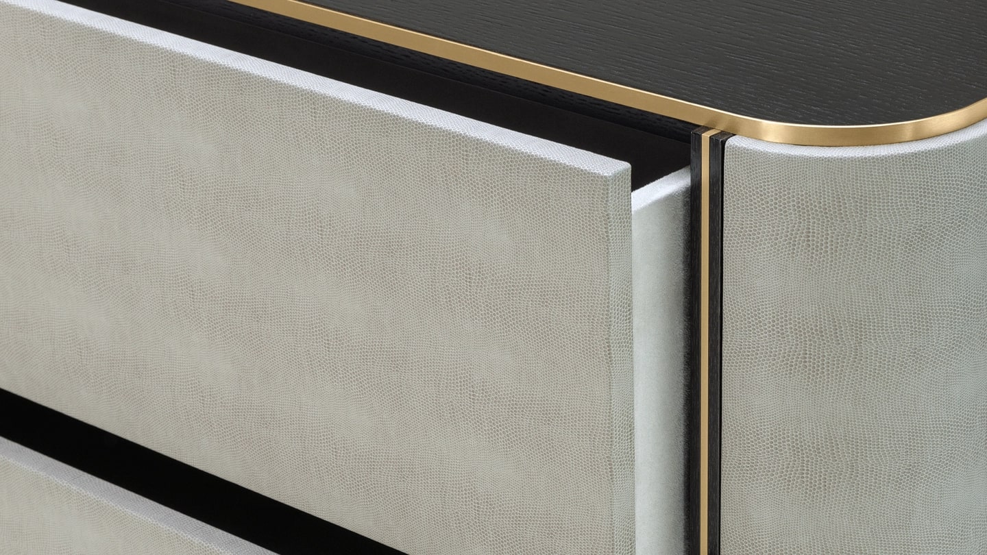 При более внимательном рассмотрении хорошо оборудованного комода KENT можно увидеть фасад, отделанный роскошной кожей. Мягко изогнутый дизайн, он включает в себя три выдвижных ящика без ручек, которые выполнены в сочетании матовой латуни и шпона темного дерева в тон поверхности.
