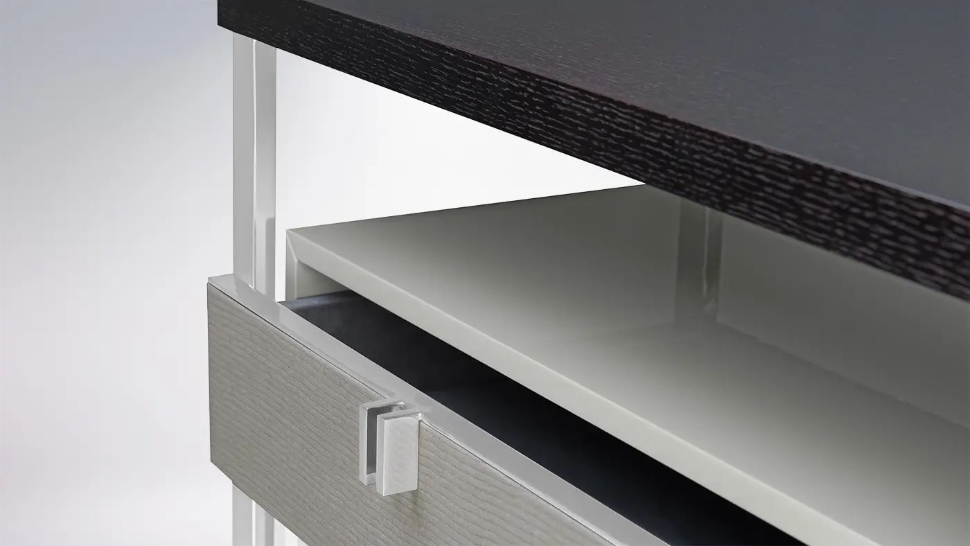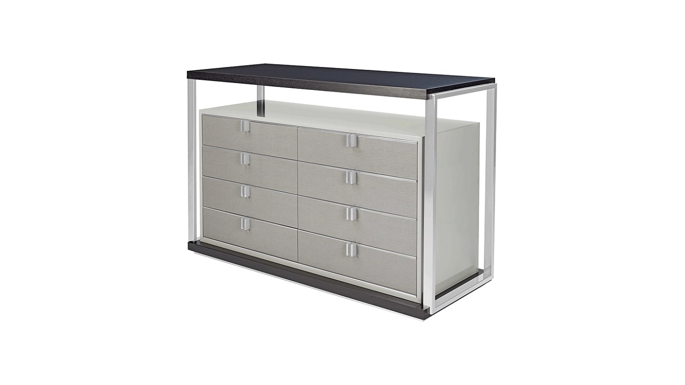 Привлекательный комод LEXTON, являющийся частью коллекции из трех предметов для хранения, воплощает идею дизайна в дизайне, представляя собой коробку из глянцевого деревянного шпона с восемью выдвижными ящиками с ручками из полированной стали, кожаными фасадами и замшевыми внутренностями. При этом взаимосвязанная структура из шпона и металла создает дополнительное пространство на поверхности и мгновенный эффект "вау".