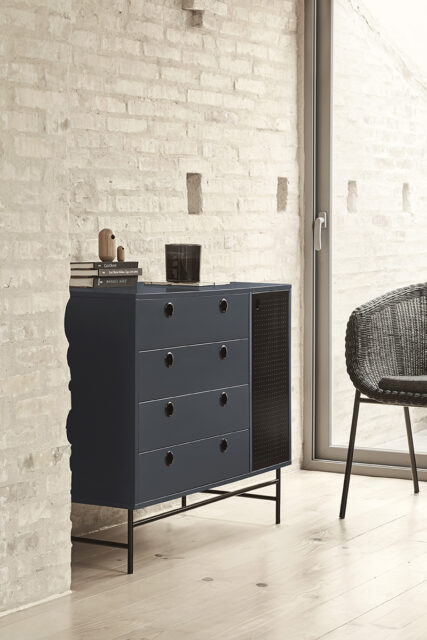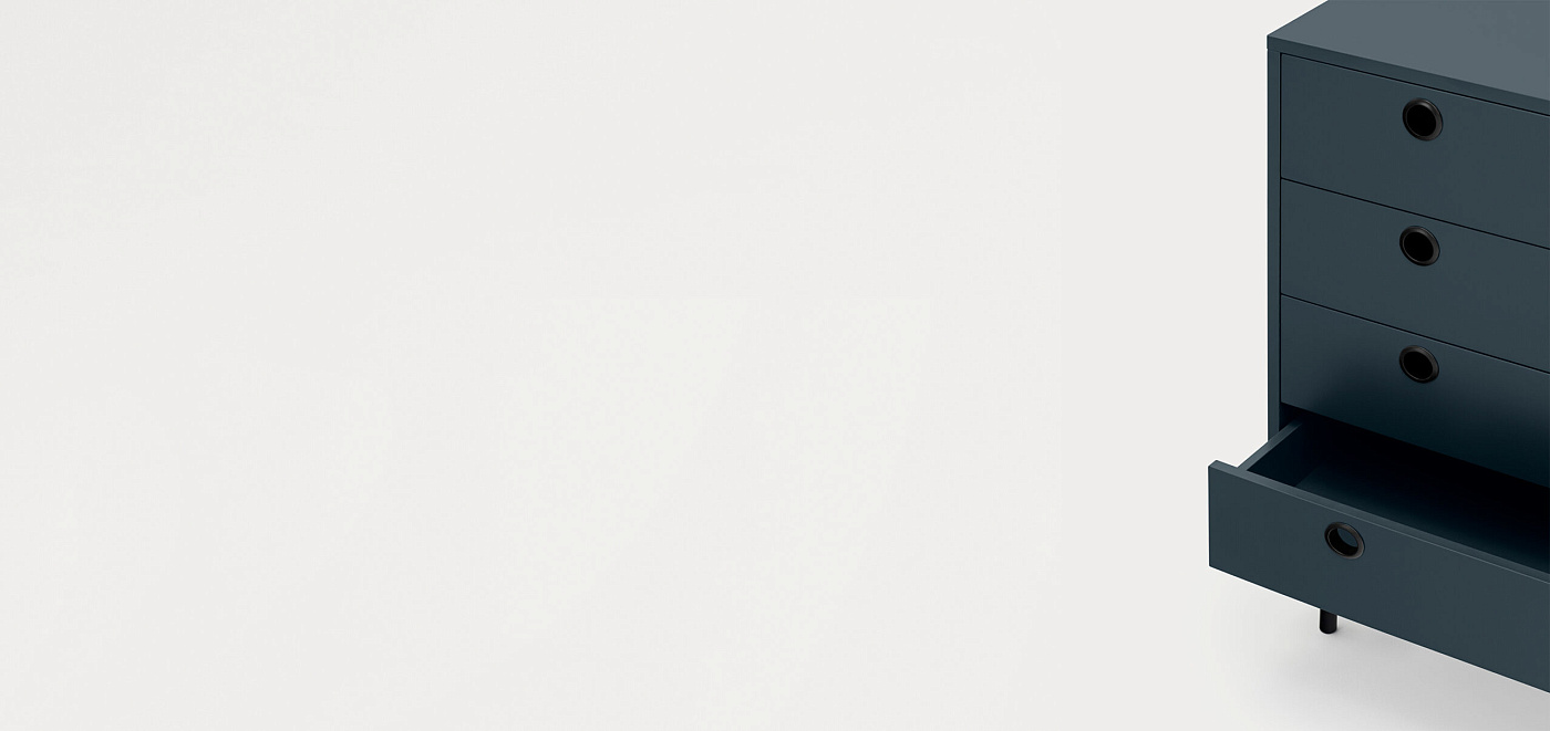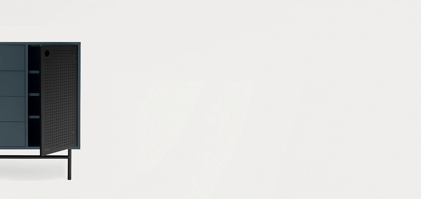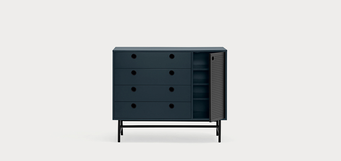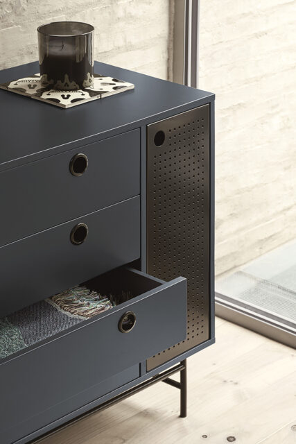 Комод Punto, оформленная в индустриальном стиле, сочетает в себе эти эстетические концепции с дизайном и функциональностью. Коллекция отличается перфорированными металлическими дверцами со встроенными круглыми ручками. Корпус выполнен в лакированном МДФ различных цветов.