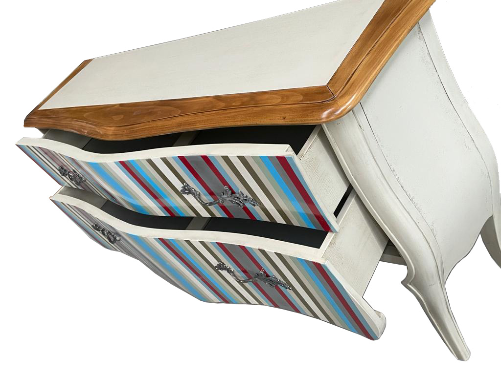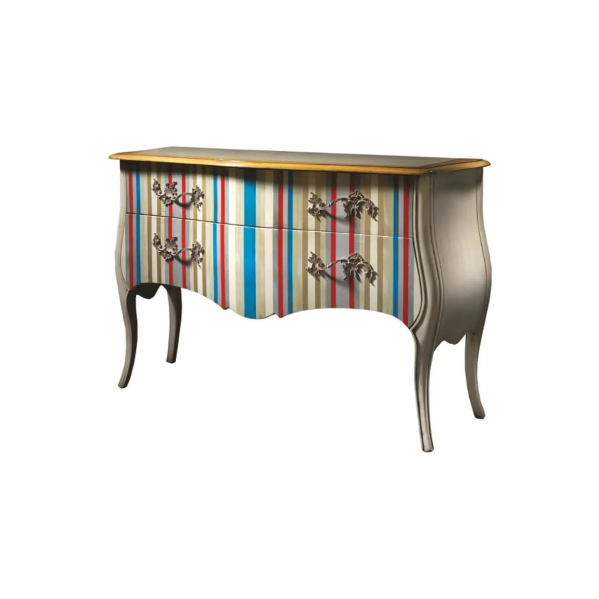 Комод Vega от испанского бренда Lola Glamour выполнен в стиле прованс. Его фасад декорирован вертикальными полосками разных цветов. Этот комод оборудован двумя выдвигающимися ящиками, на передней части каждого из которых расположено по две металлические ручки причудливой формы. Сочетание ярких цветов и необычных форм является фирменным стилем фабрики Lola Glamour. Корпус комода, его основание и ящики изготовлены из массива португальской вишни. По желанию цвет и размеры комода Vega могут быть изменены.