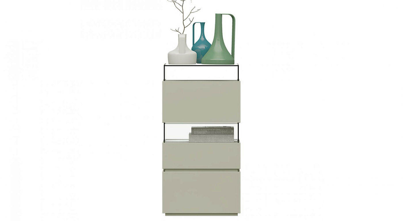 Элементы минималистского дизайна с совершенно неожиданными деталями. Уменьшение конструкции позволяет использовать стеклянную, керамическую или минеральную столешницу. Историческое изделие EMEDE, которое со временем стало популярным. В данном случае для соединения двух выдвижных ящиков были использованы два стеклянных элемента. Оснащен противоскользящими направляющими BLUM и бесшумным закрыванием. Это знаковое изделие компании.