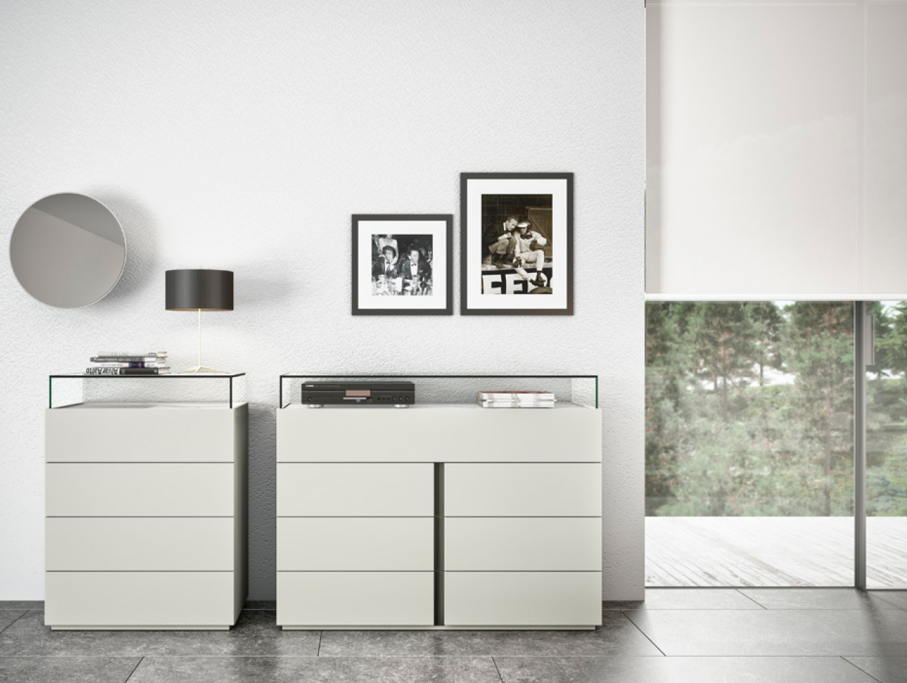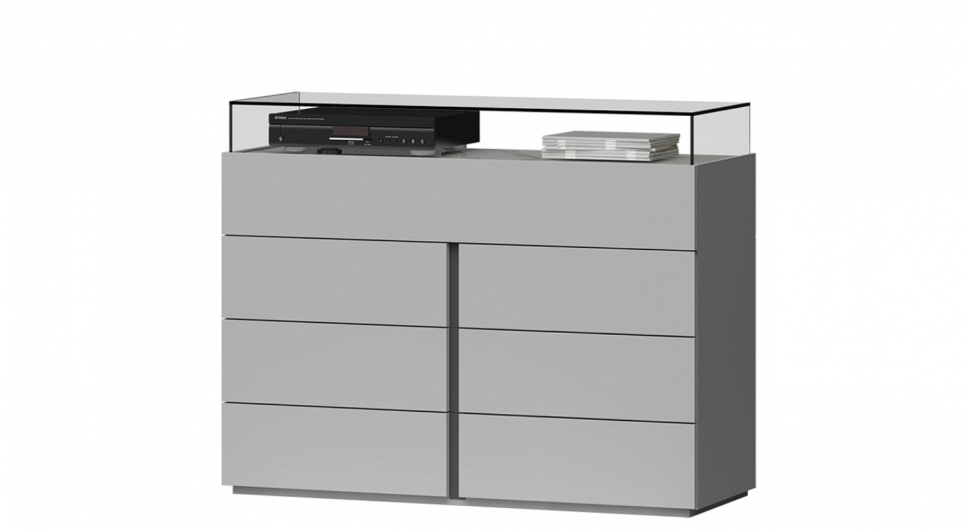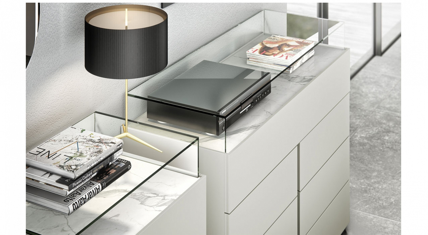 Комод CLASS 4T в минималистичном дизайне с удивительными функциями. Уменьшение его конструкции позволяет установить столешницу из стекла, керамики или минерала. Стеклянная деталь встроена в верхнюю часть в качестве контрастной детали дизайна. Снабжен противоскользящими направляющими BLUM и амортизирующей застежкой. Отделка модели на изображении: Лак Piedra Белый камень Прозрачное стекло