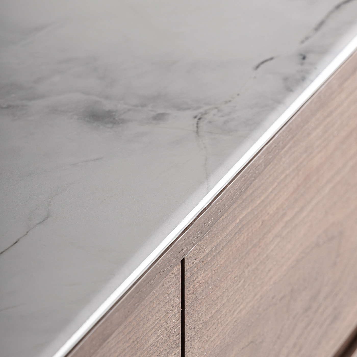 Современный комод Stuetta, изготовленный из коричневой фанеры в сочетании с дубовым шпоном и белым спеченным камнем с прожилками. Ширина: 140 см, Глубина: 45 см, Высота: 76 см
