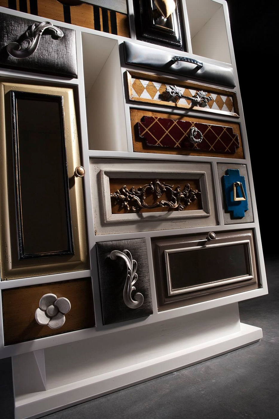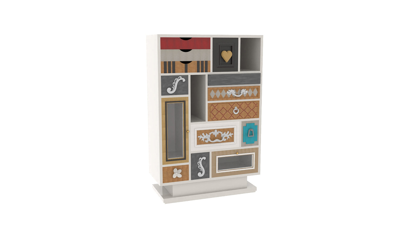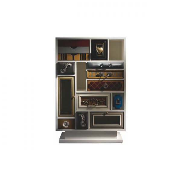 Высокий комод Punk от испанского производителя дизайнерской мебели фабрики Lola Glamour изготовлен вручную из массива португальской вишни. Основной темой его дизайна является причудливое сочетания различных текстур, узоров, цветов и материалов отделки. Каждый ящик этого комода имеет свою дверцу и уникальную ручку на ней. Дизайн отдельных элементов высокого комода Punk будто бы сошел с полотен великого Сальвадора Дали.