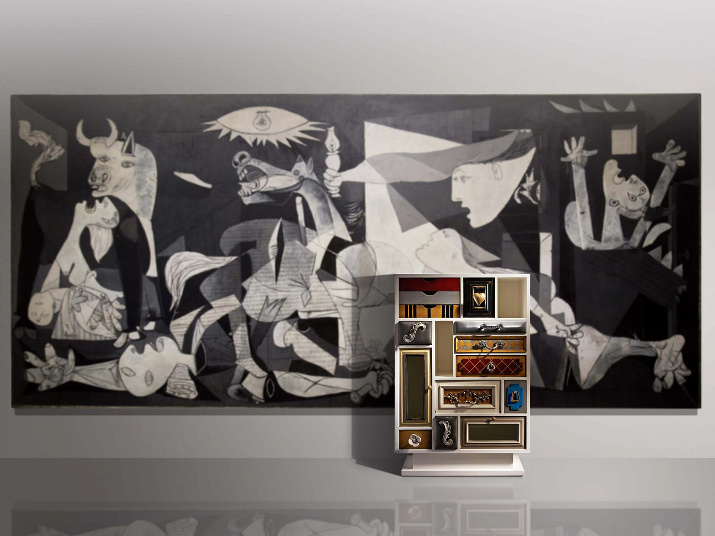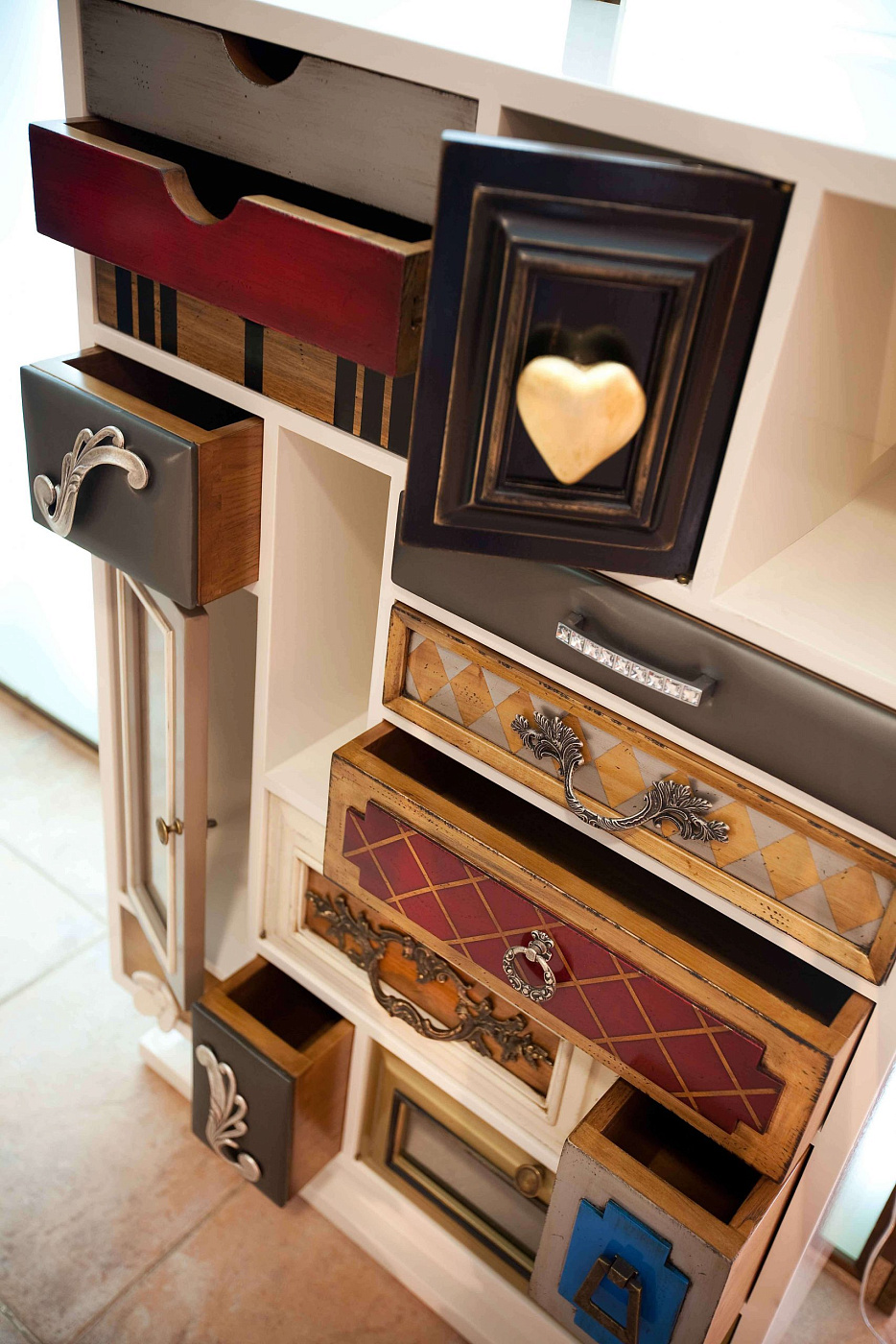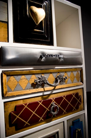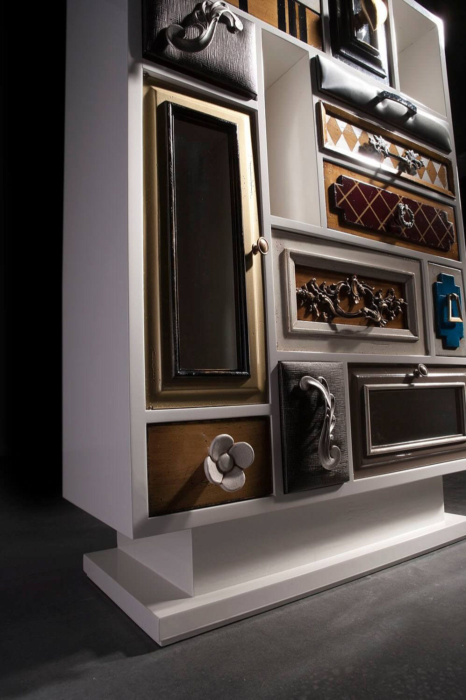 Высокий комод Punk от испанского производителя дизайнерской мебели фабрики Lola Glamour изготовлен вручную из массива португальской вишни. Основной темой его дизайна является причудливое сочетания различных текстур, узоров, цветов и материалов отделки. Каждый ящик этого комода имеет свою дверцу и уникальную ручку на ней. Дизайн отдельных элементов высокого комода Punk будто бы сошел с полотен великого Сальвадора Дали.