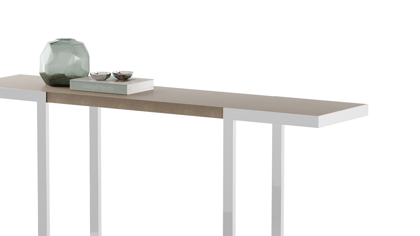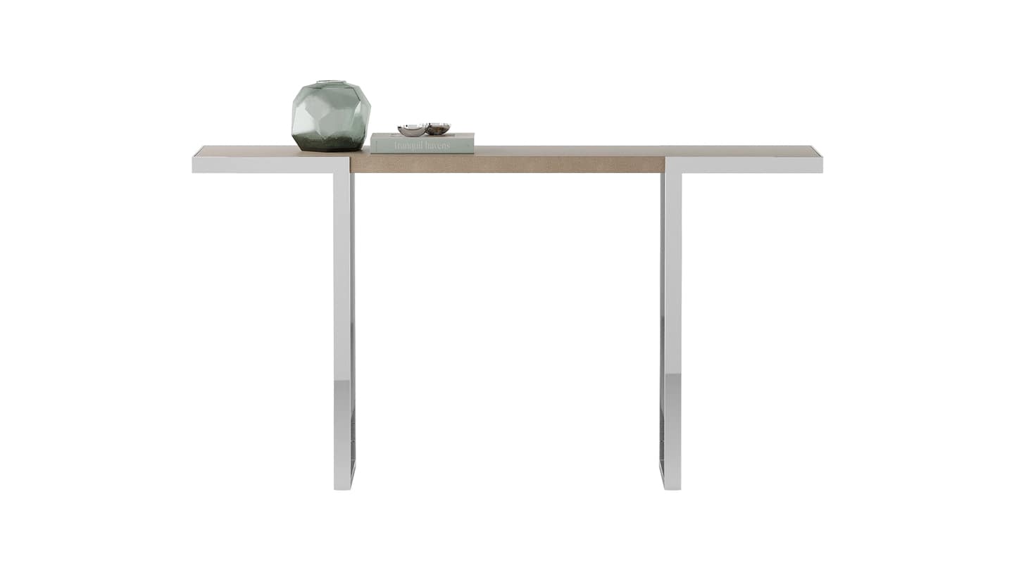Изготовленная всего из двух элегантных материалов, хорошо спроектированная консоль AMAVI демонстрирует красоту простоты. Прямоугольная часть из разноцветного камня частично покрыта полированной нержавеющей сталью, которая плавно переходит в угловые ножки.