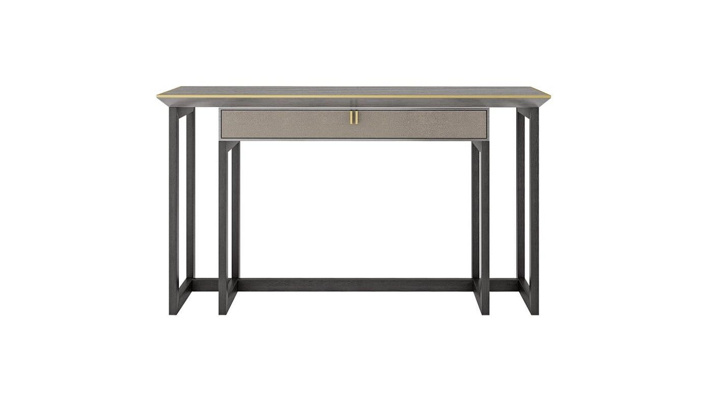 Инновационная консоль BALI, представляющая собой авангардный подход к дизайну внутри дизайна, включает в себя ящик из шпона дерева с кожаной передней частью и замшевой внутренней частью, поверхность из шпона дерева, ручки и швы из матовой латуни, а также каркас из массива дерева.