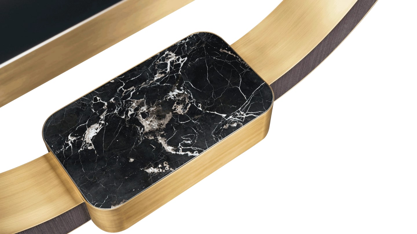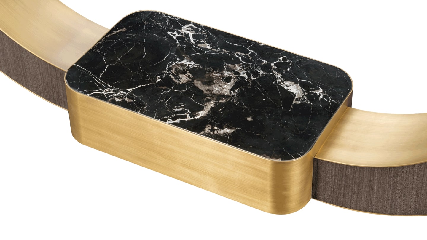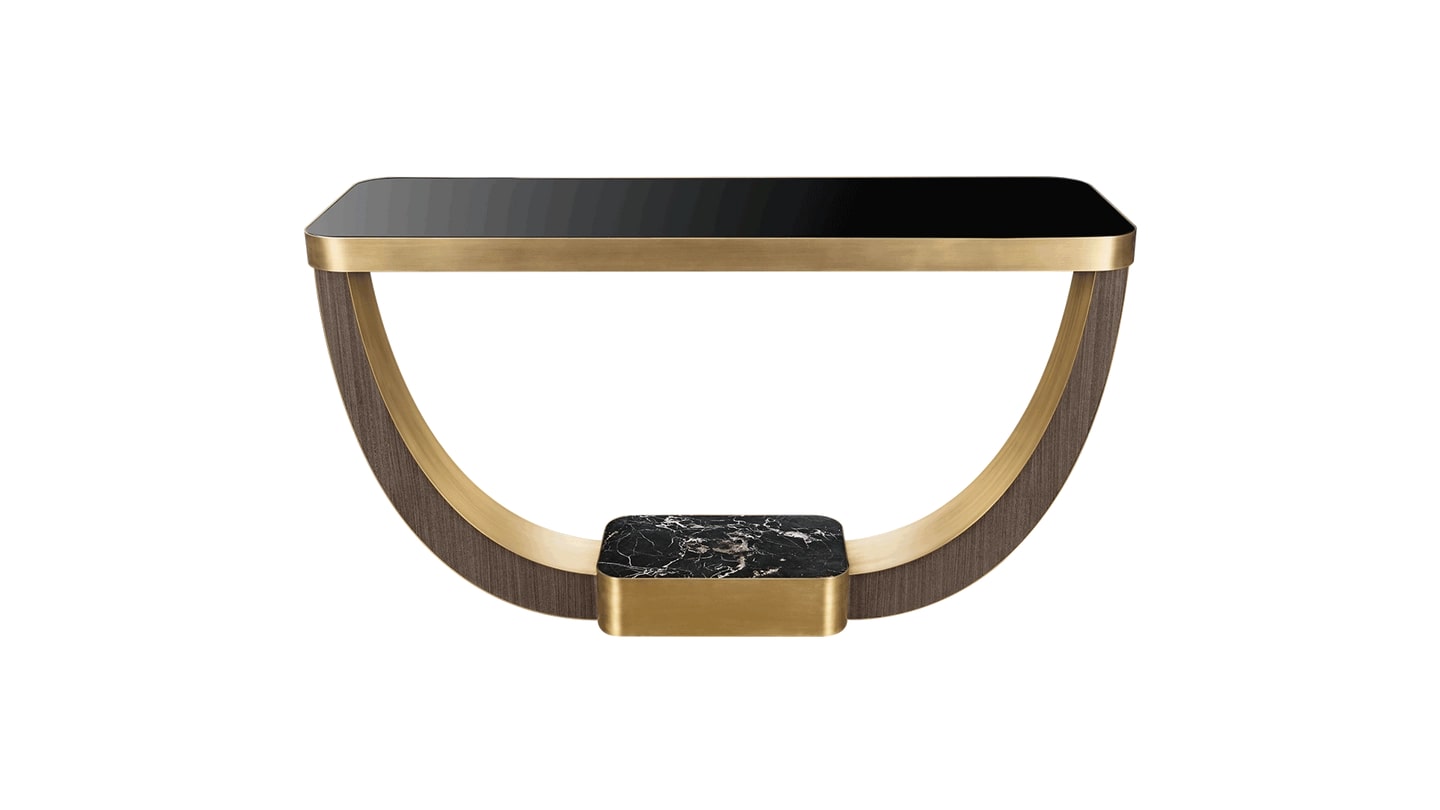 Красивая консоль из БОЛОНЬИ с изящными изгибами и мягкими краями создает ощущение легкости и беззаботности, которое подкрепляется поразительным каменным основанием, прямоугольная форма которого перекликается с мягкими контурами тонкой столешницы из черного стекла.