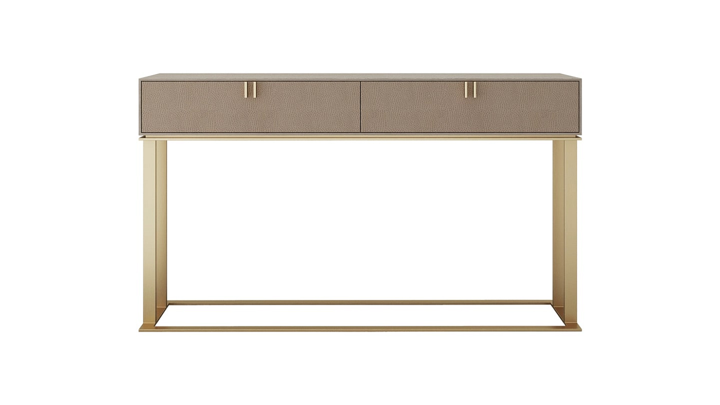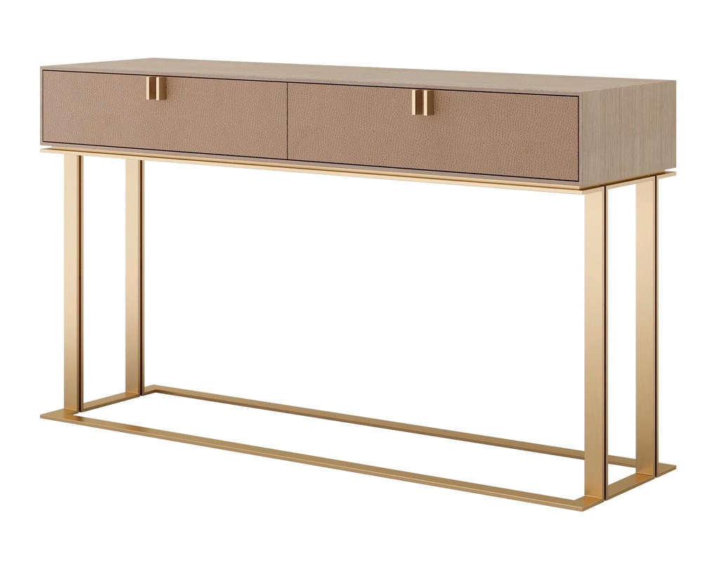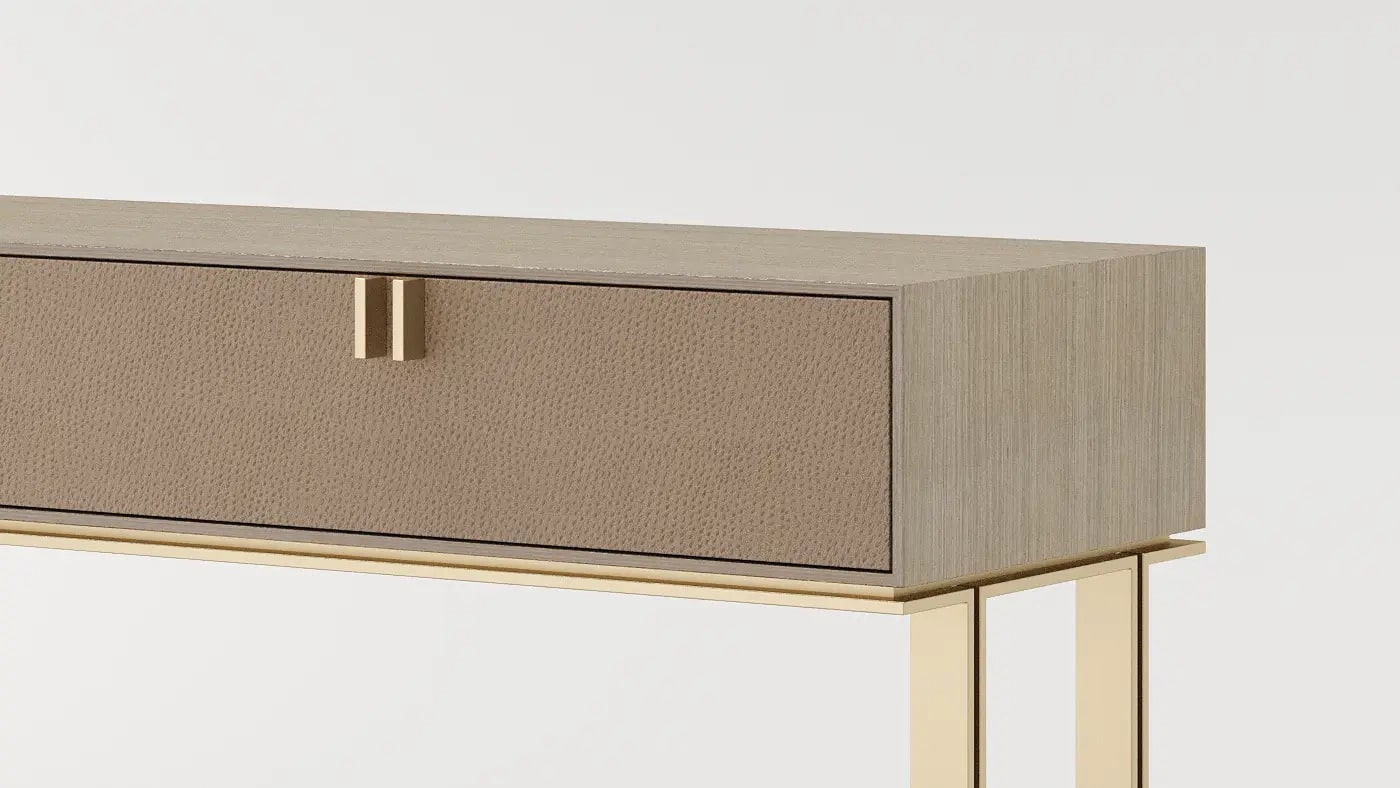 Консоль BRISBANE сочетает в себе функциональность и сказочность. Вверху прямоугольный ящик, вырезанный из деревянного шпона, содержит два выдвижных ящика с металлическими ручками, кожаными передними и замшевыми внутренними поверхностями. Внизу архитектурный фундамент подчеркивает красоту матовой латуни и придает ей непосредственный эффект.